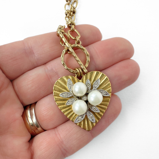 Large solid brass heart pendant with vintage pearl and rhinestone embellishment
