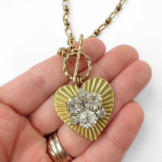 Large solid brass heart pendant with vintage clear rhinestone embellishment