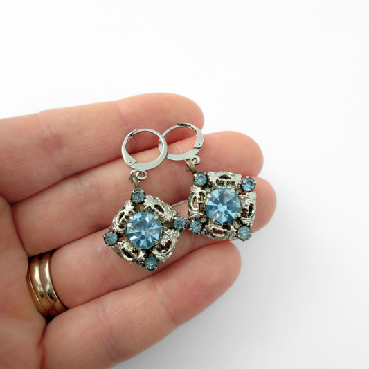 Refashioned vintage silver filigree and ice blue rhinestone earrings