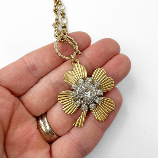 Large solid brass four leaf clover pendant with vintage clear rhinestone embellishment