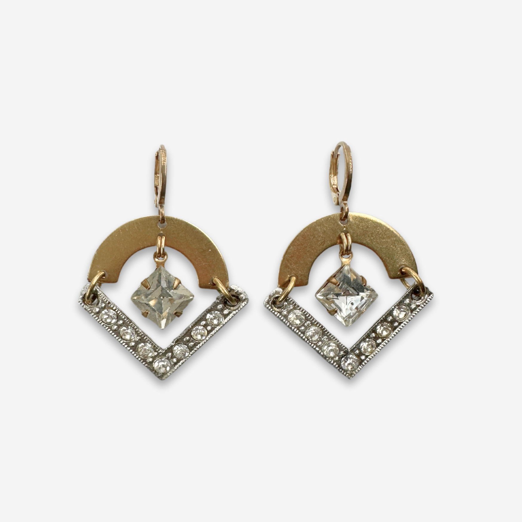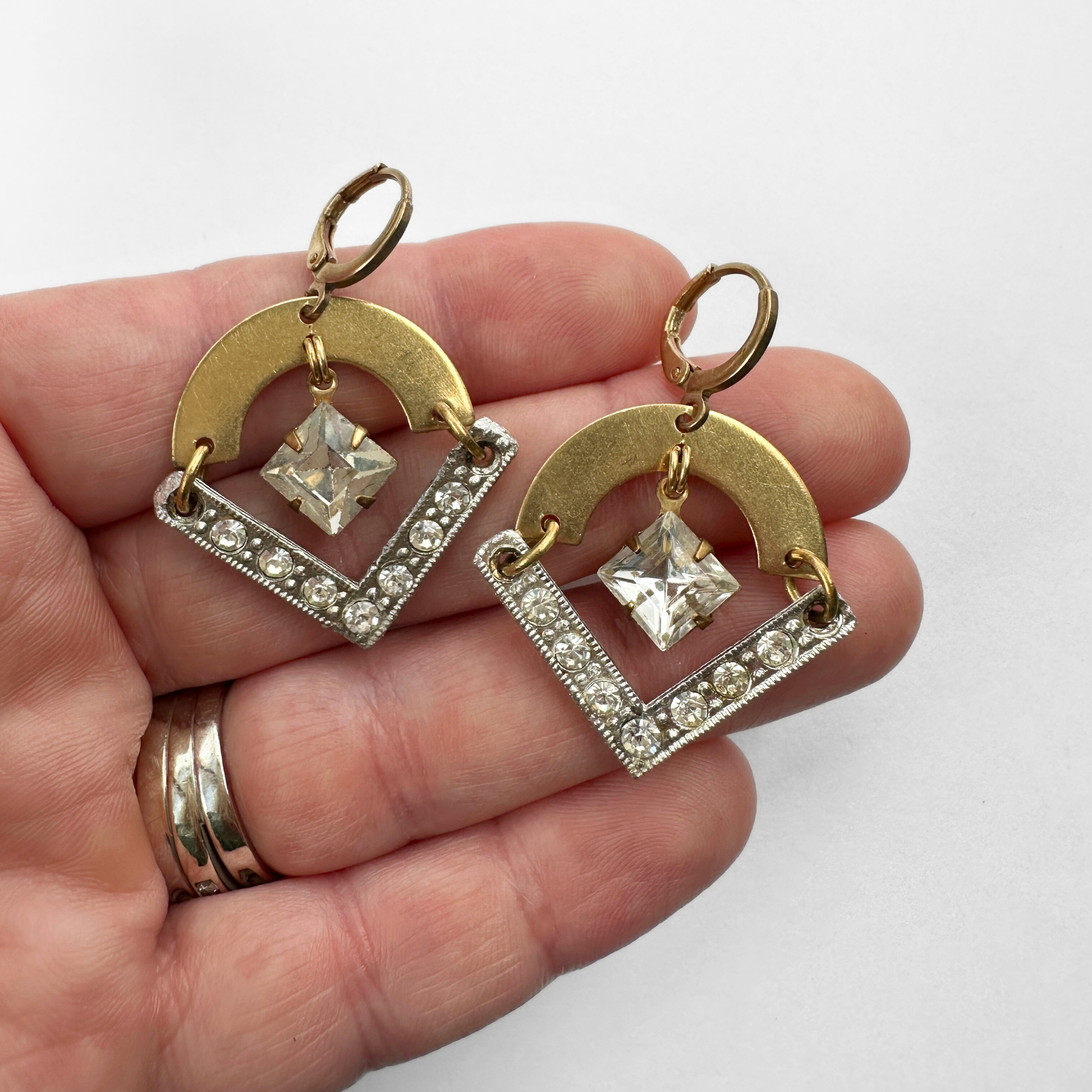 Smooth raw brass arch connectors are paired with vintage clear crystal V-shaped drops (originally the corners of a buckle.) Square clear crystal drop with brass lever back clasps.