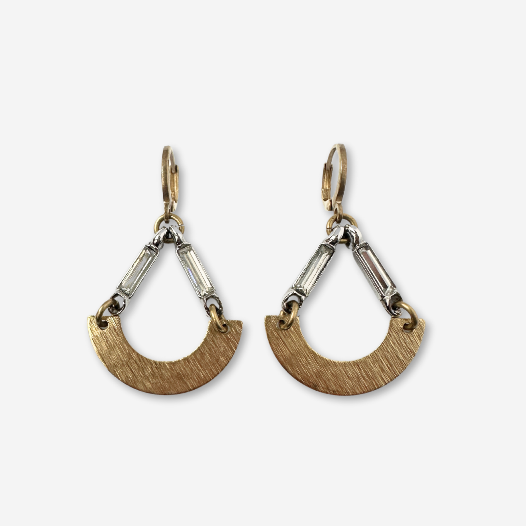 Brushed raw brass arch drops are paired with vintage clear rhinestone baguette links. Brass lever back clasps.