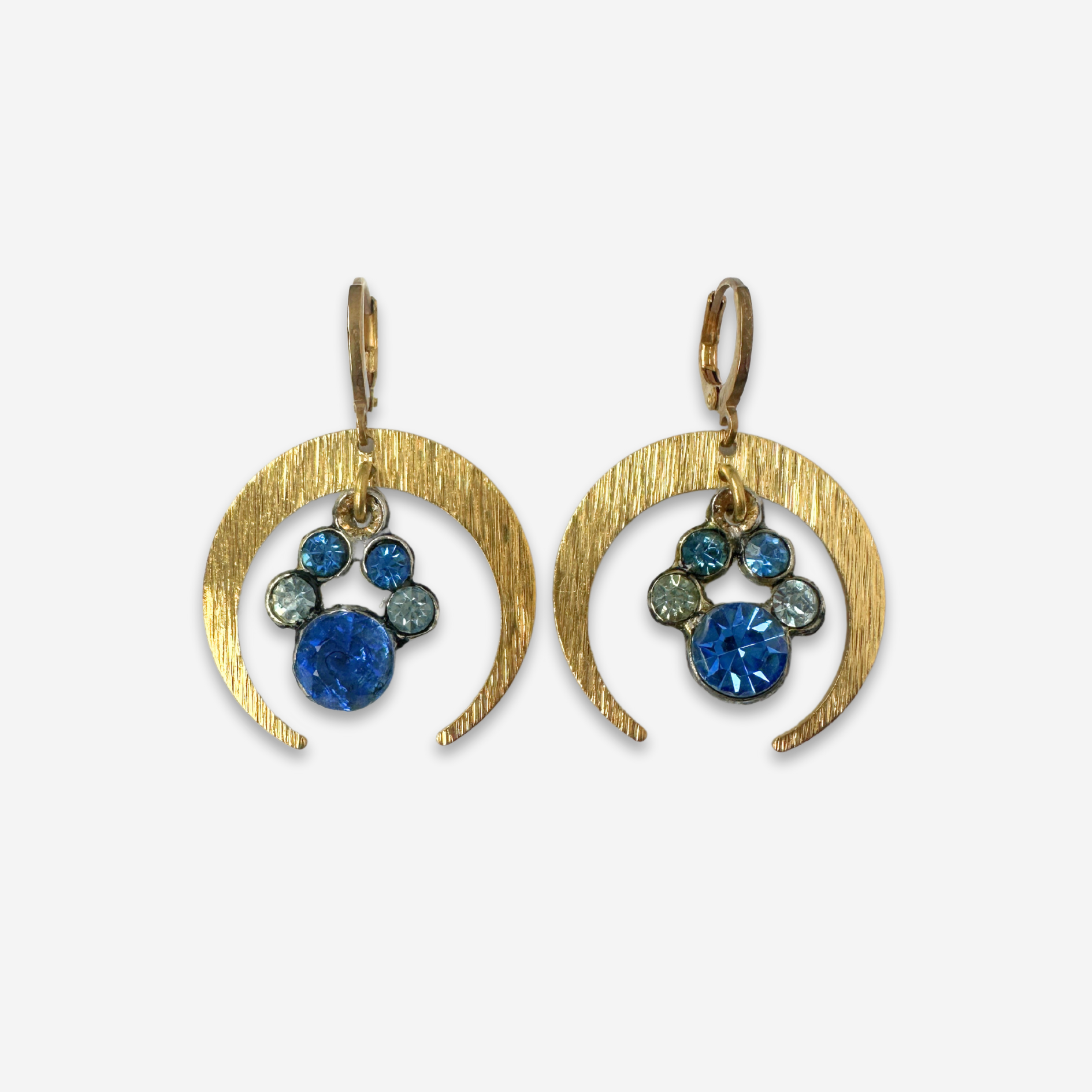 Brass crescent hoop earrings with vintage blue rhinestone center drops