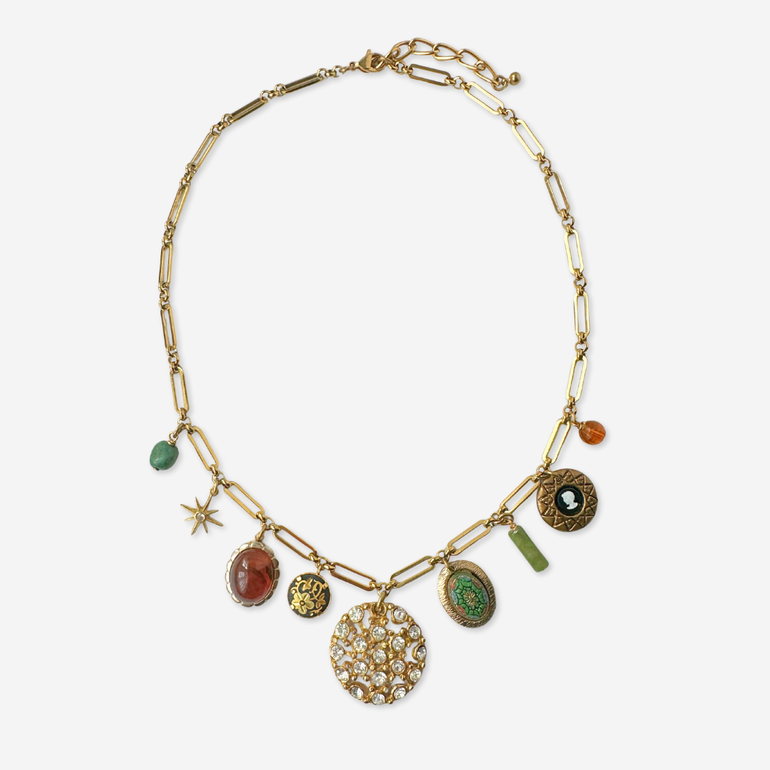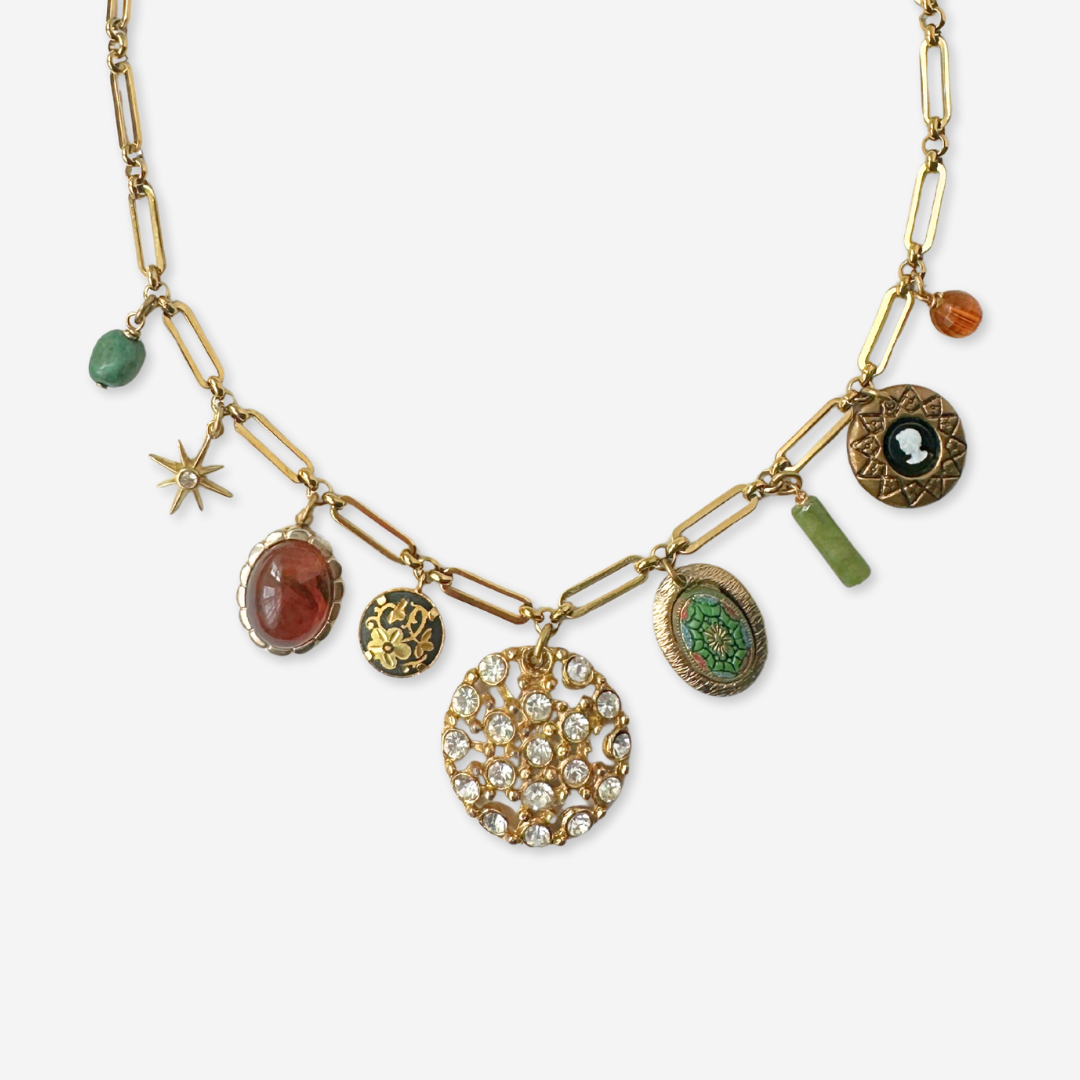 - Created using a combination of both new and repurposed vintage pieces, including beads, charms, buttons and rhinestones.