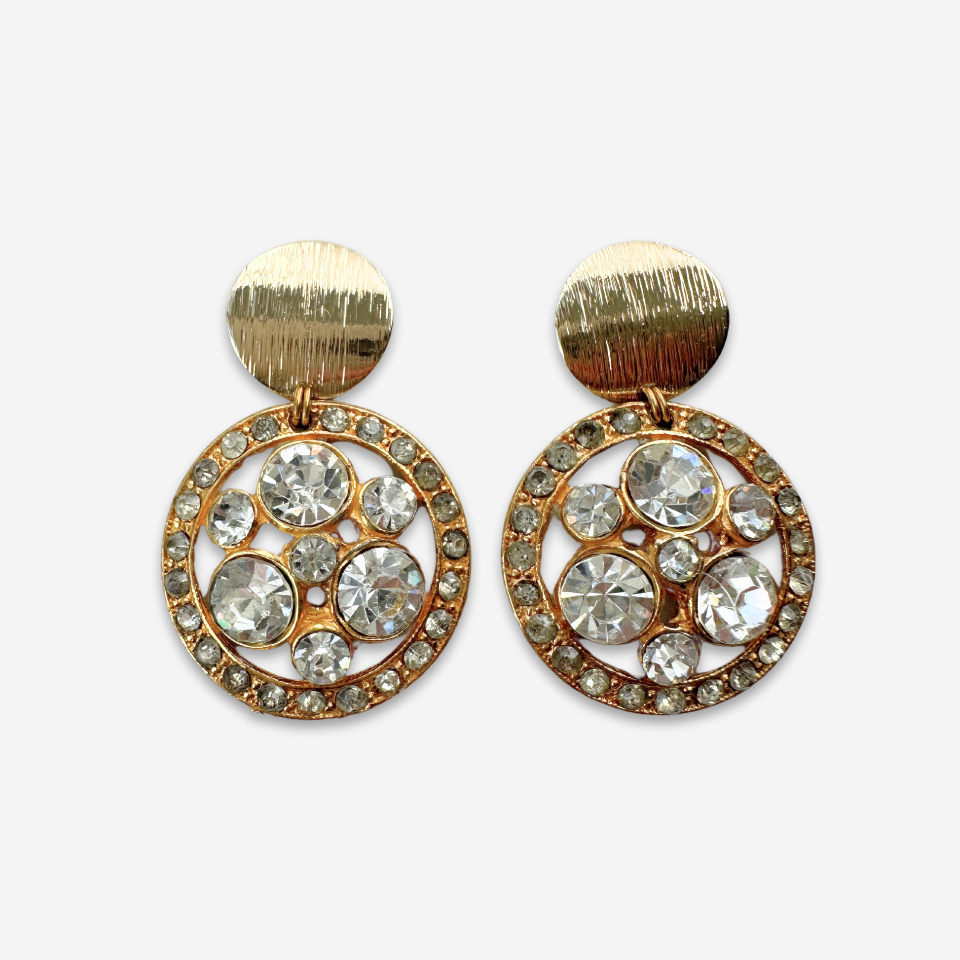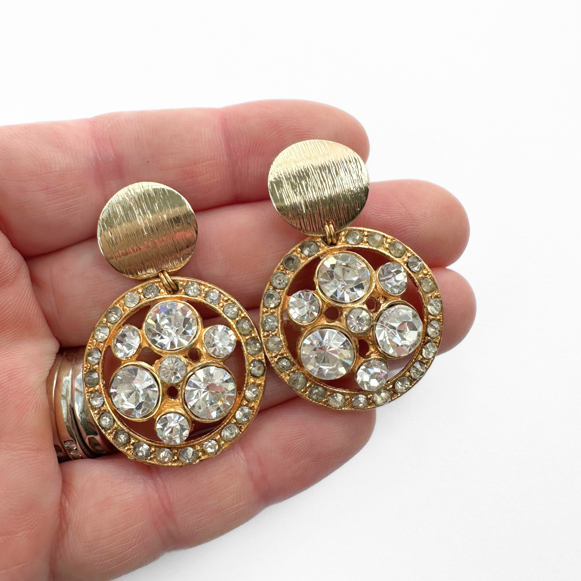 Large vintage gold tone rhinestone button earrings