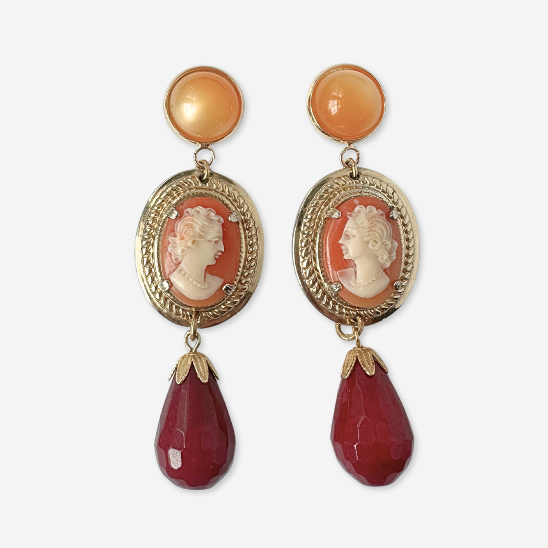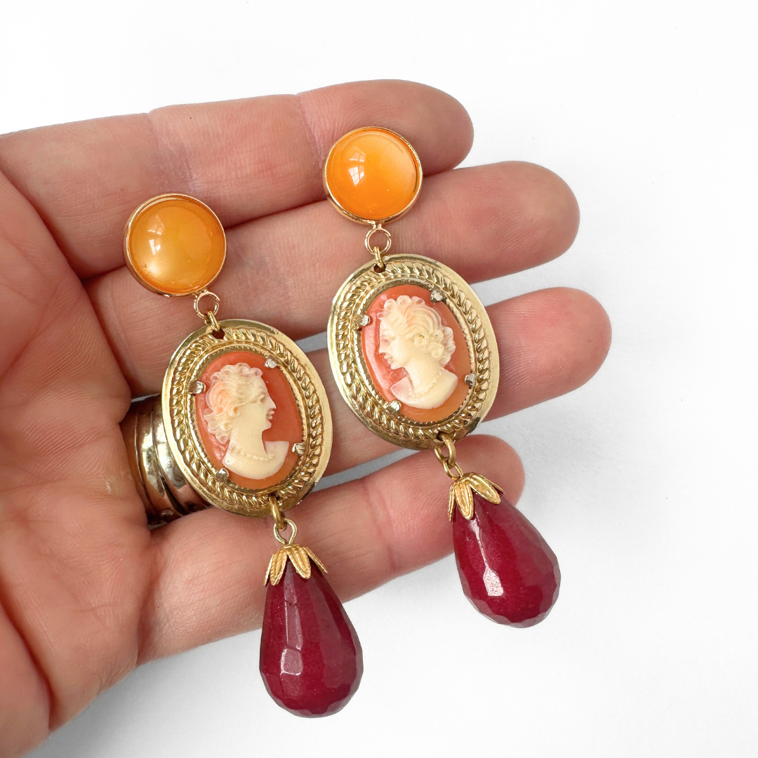 Large refashioned vintage coral cameo earrings with burgundy stone drops
