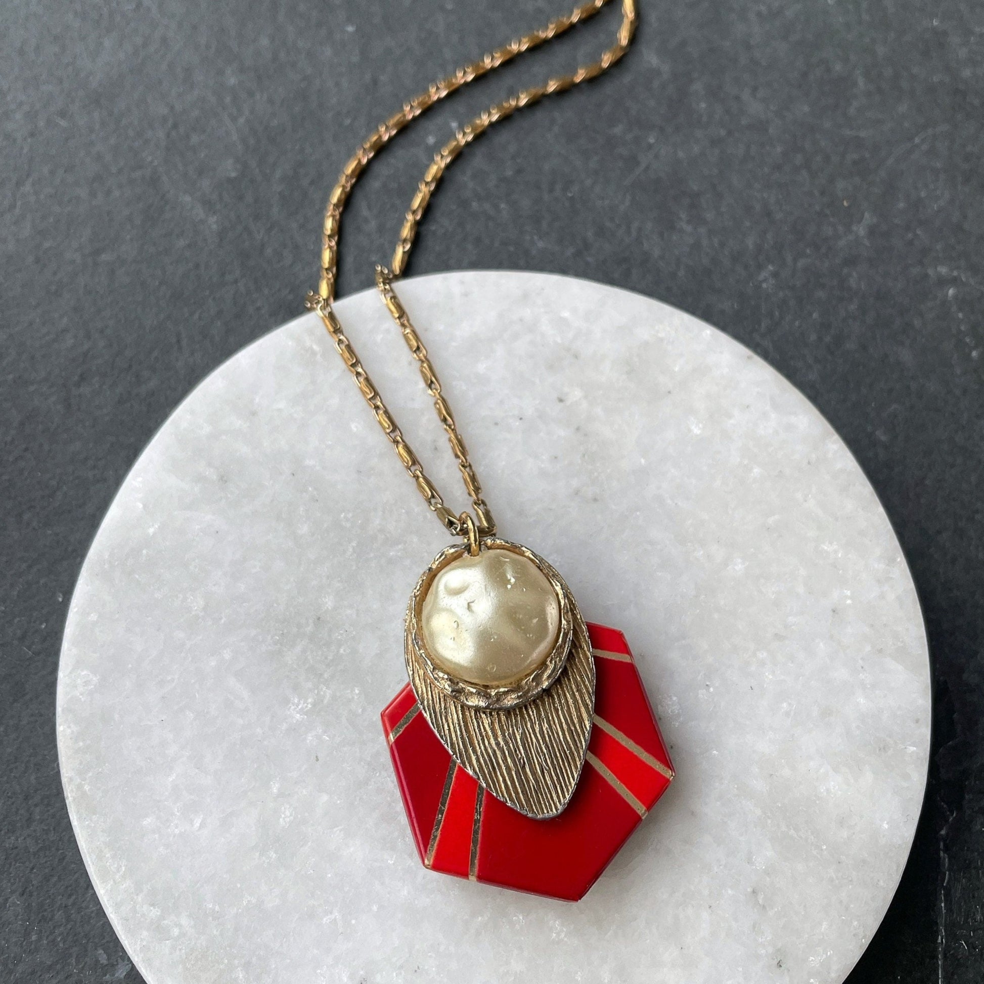 A vintage red plastic and metal hexagon (originally 1/2 of a belt buckle and stamped Czechoslovakia) has been embellished with a vintage gold tone earring with pearl center.