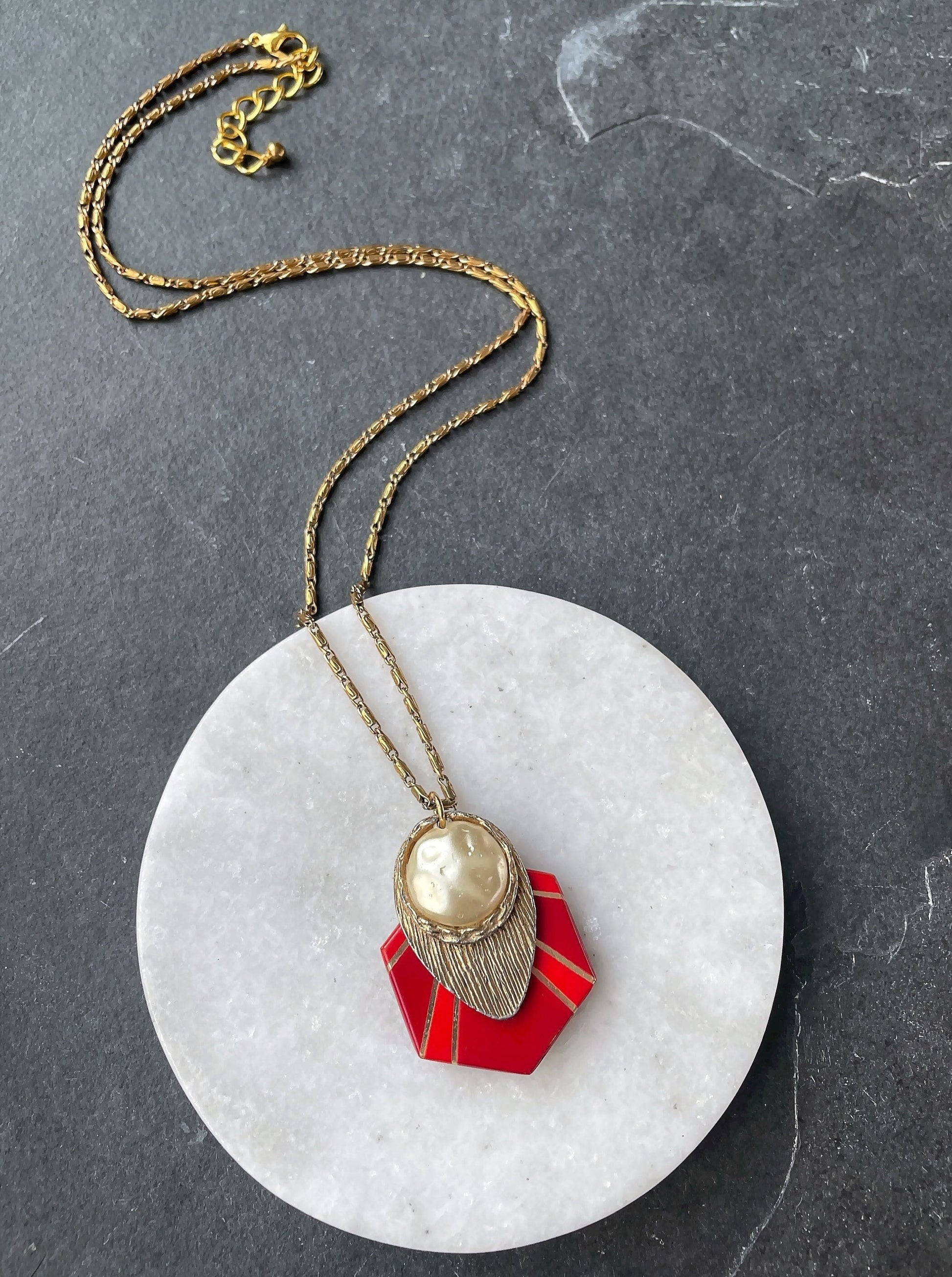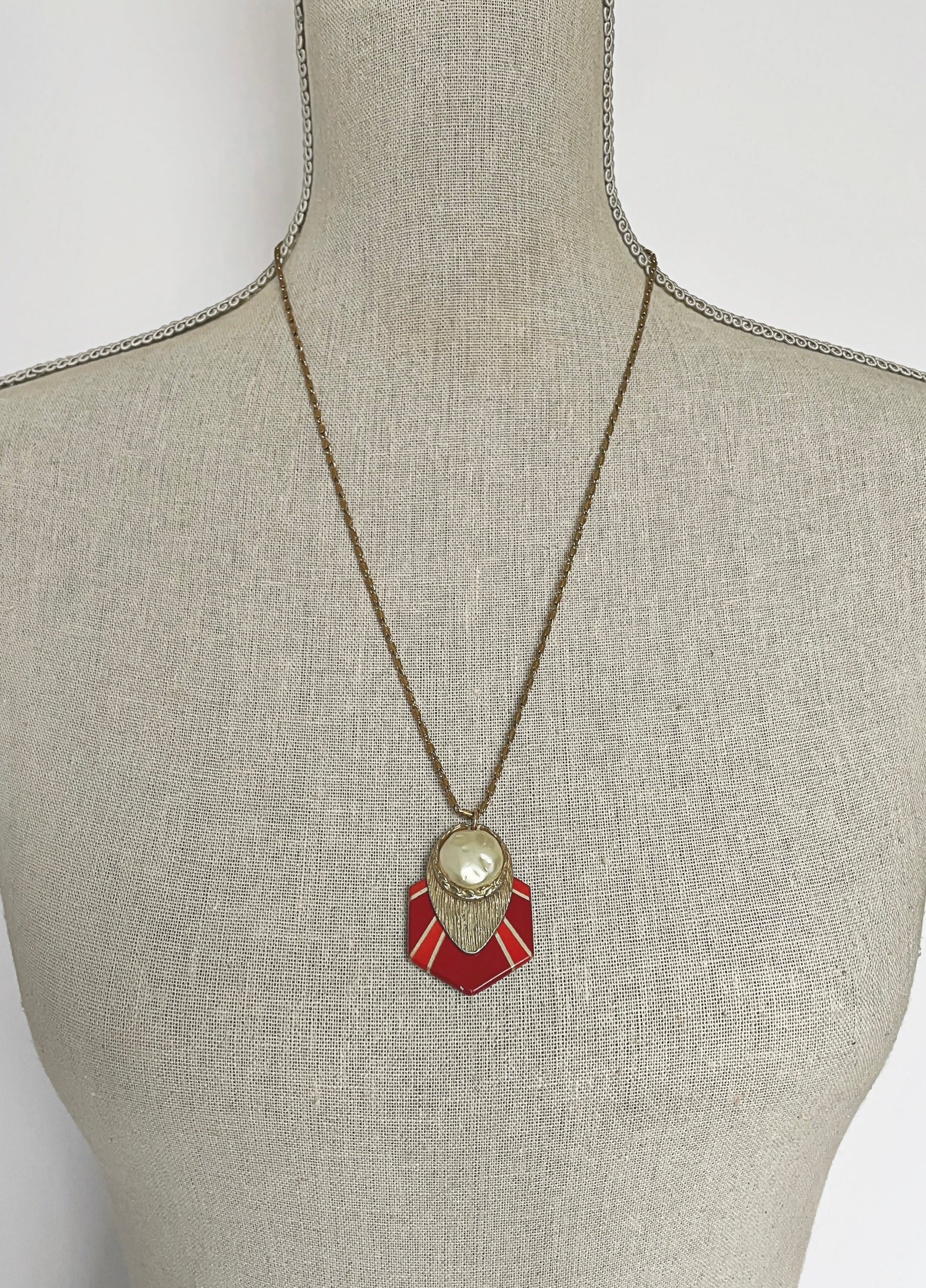 Red and gold vintage assemblage long pendant necklace