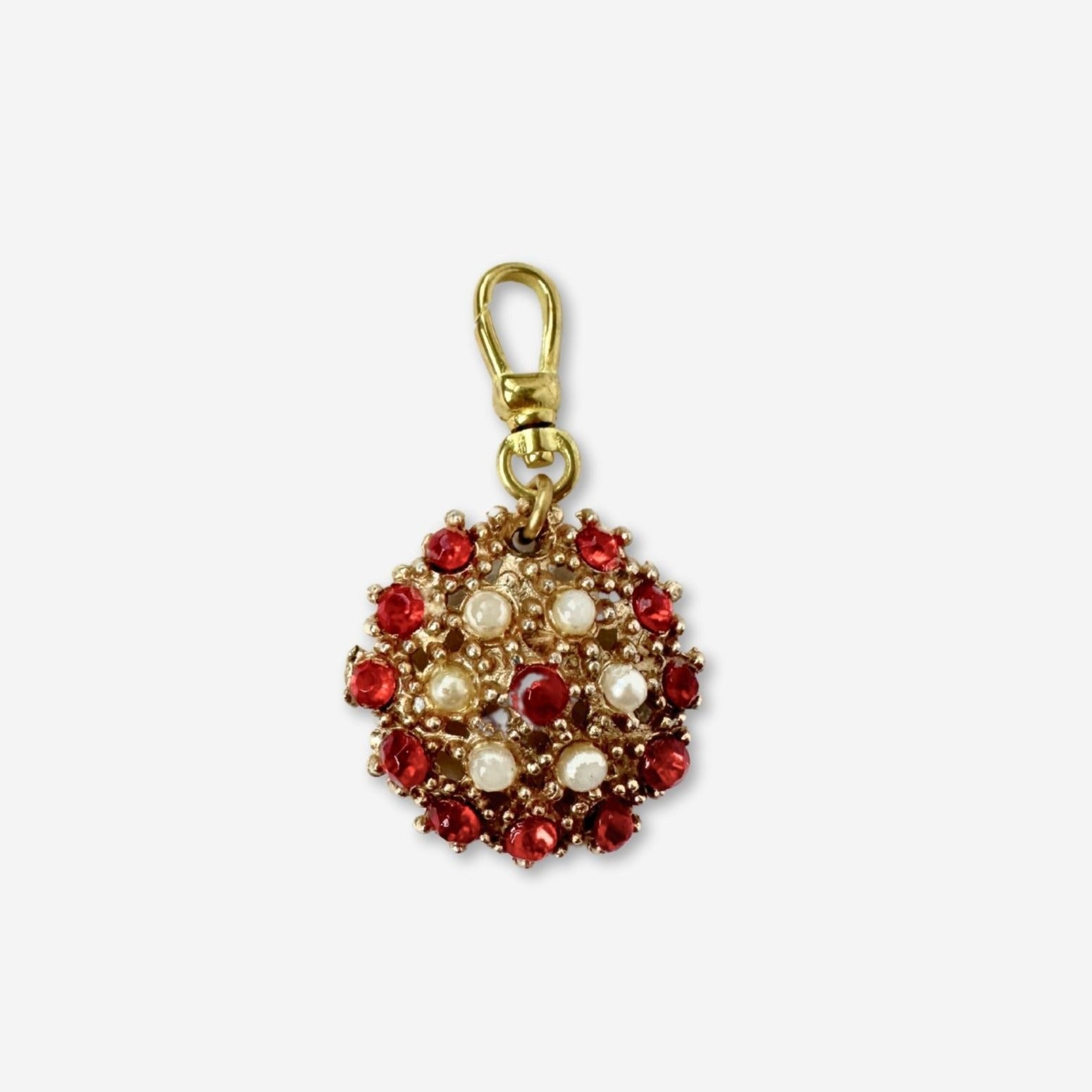 Red rhinestone and pearl vintage charm on brass swivel clasp