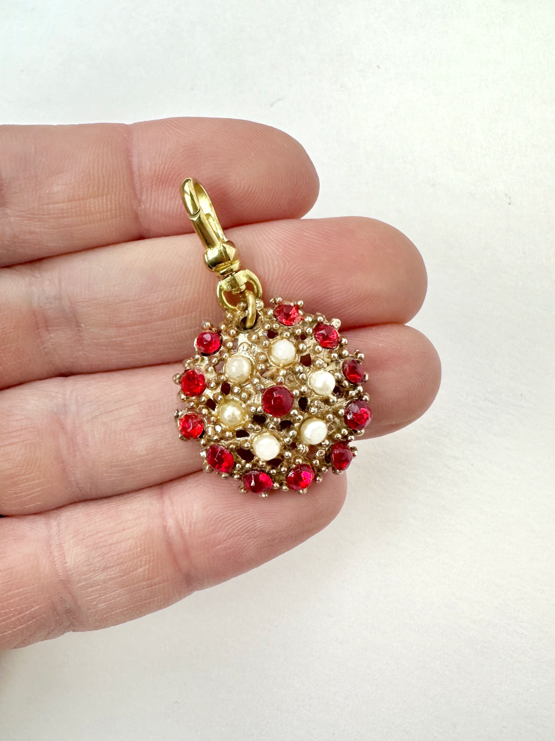 This one of a kind charm was originally a vintage earring, and contains red glass rhinestones and faux pearls in a matte gold tone setting.