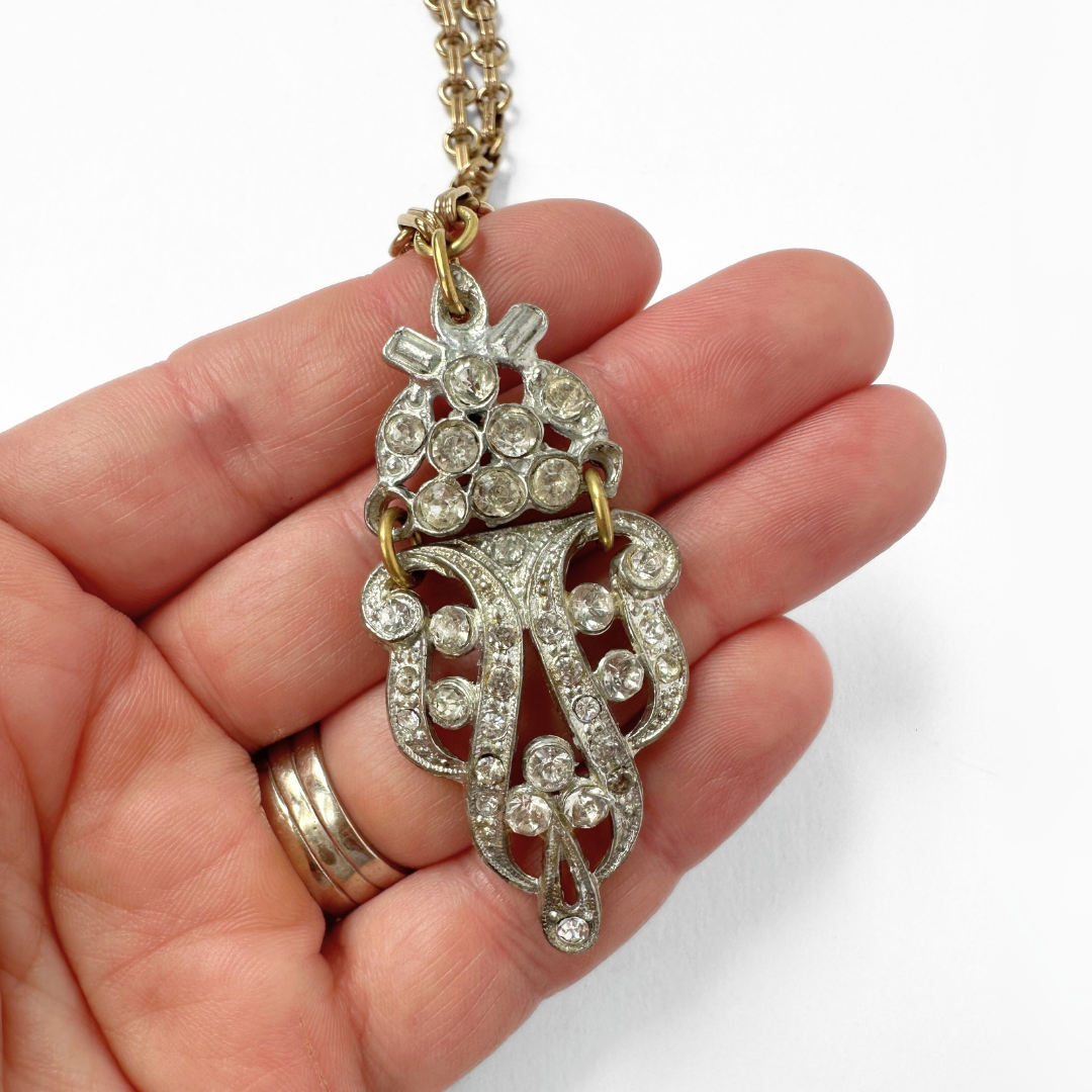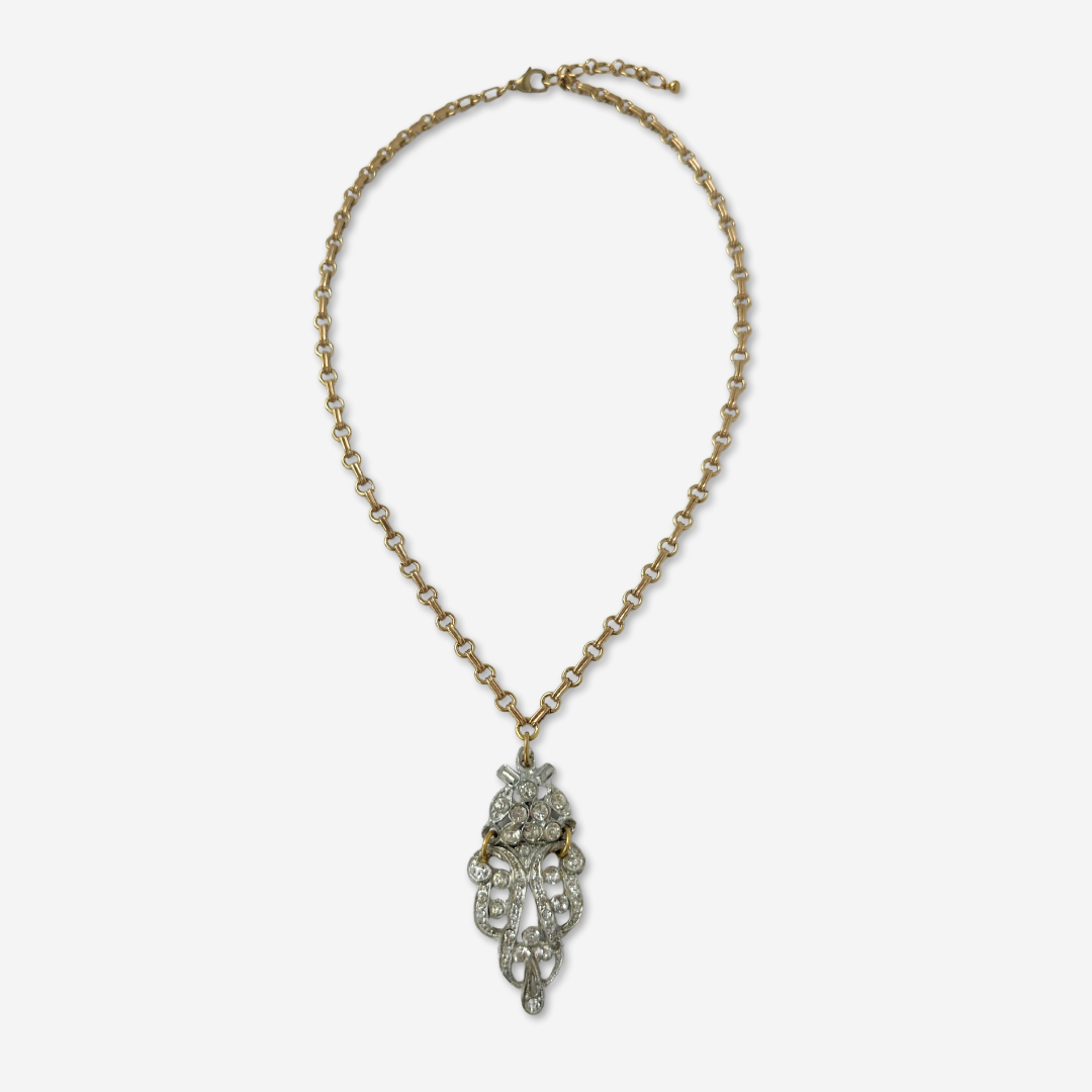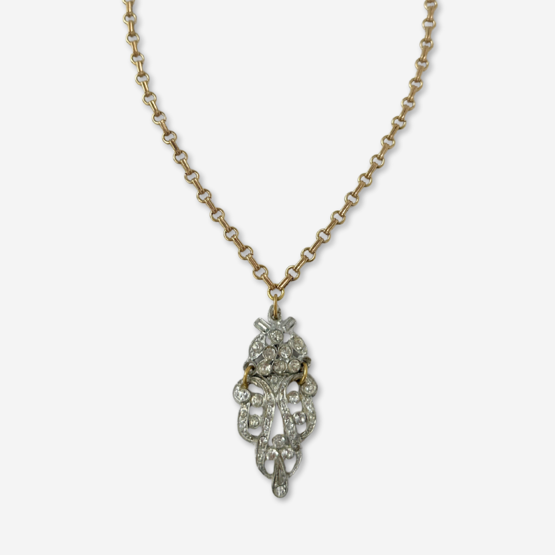 Refashioned 2-pc vintage art deco rhinestone and brass pendant assemblage necklace