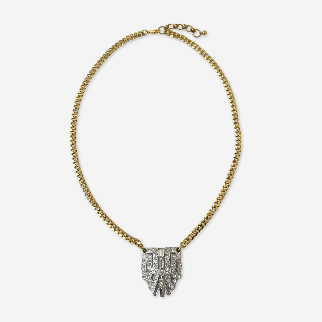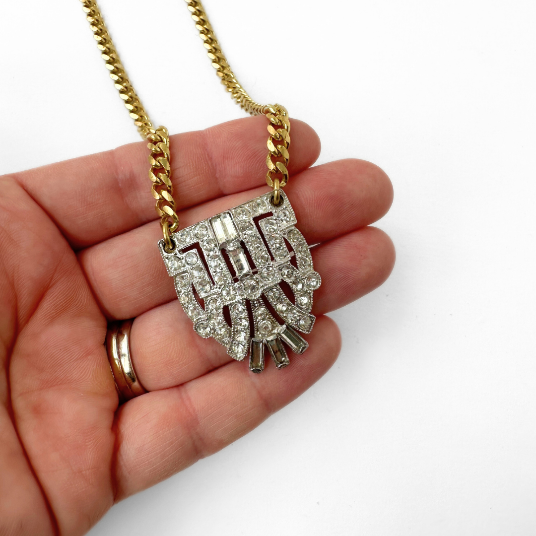 Refashioned art deco rhinestone pendant necklace on brass chain