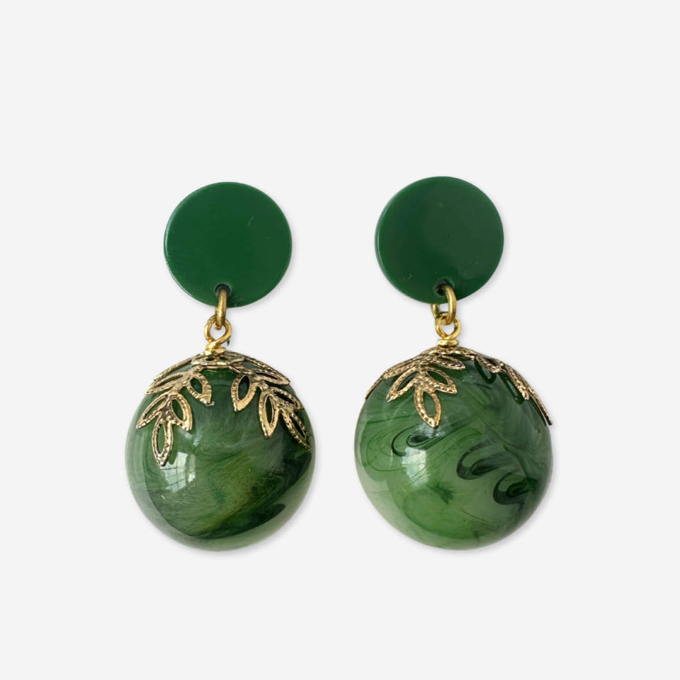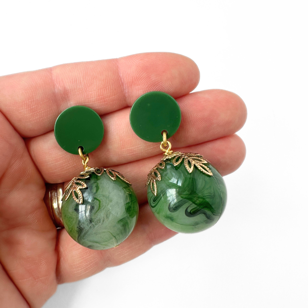 Oversized vintage green swirl bead earrings with brass leaf bead cap