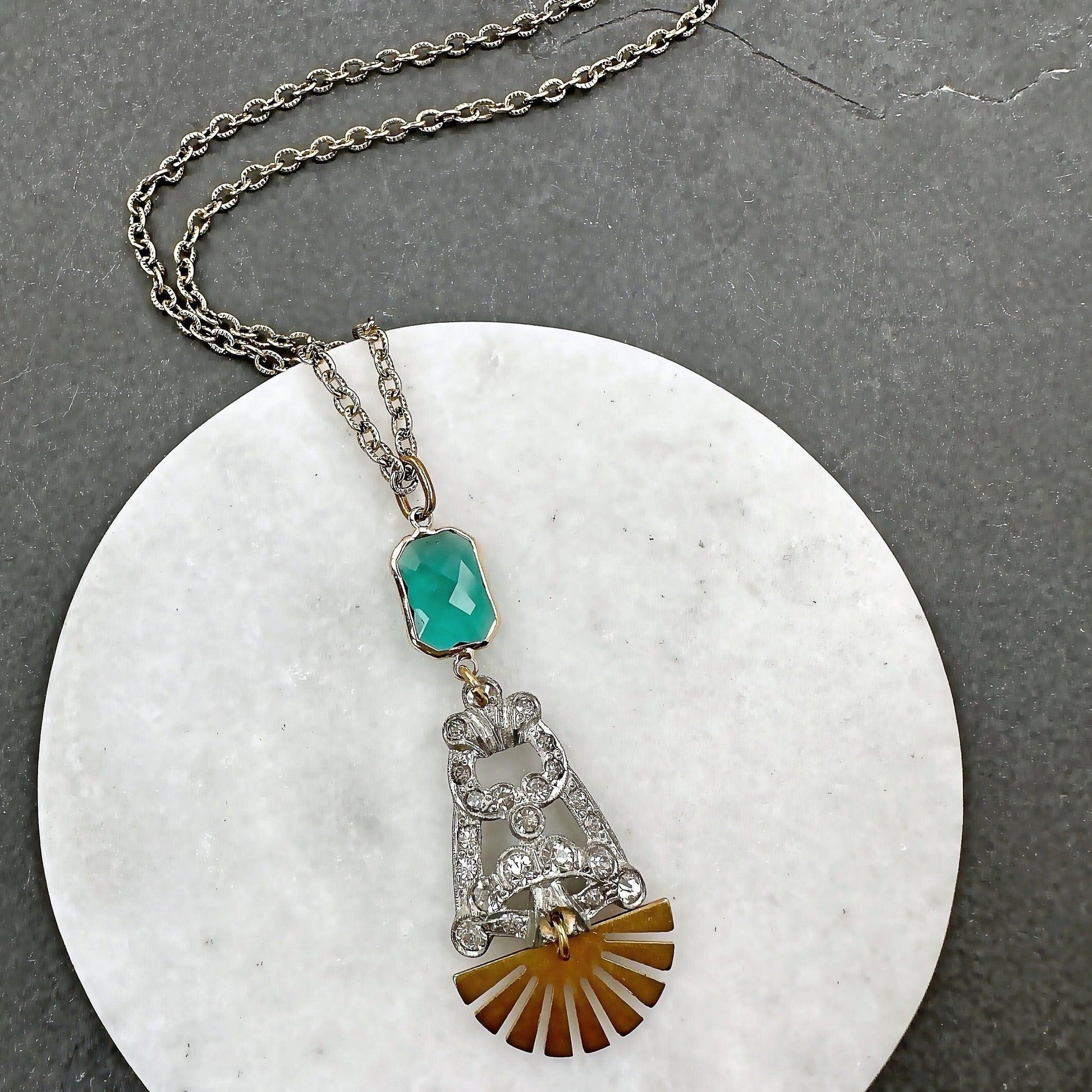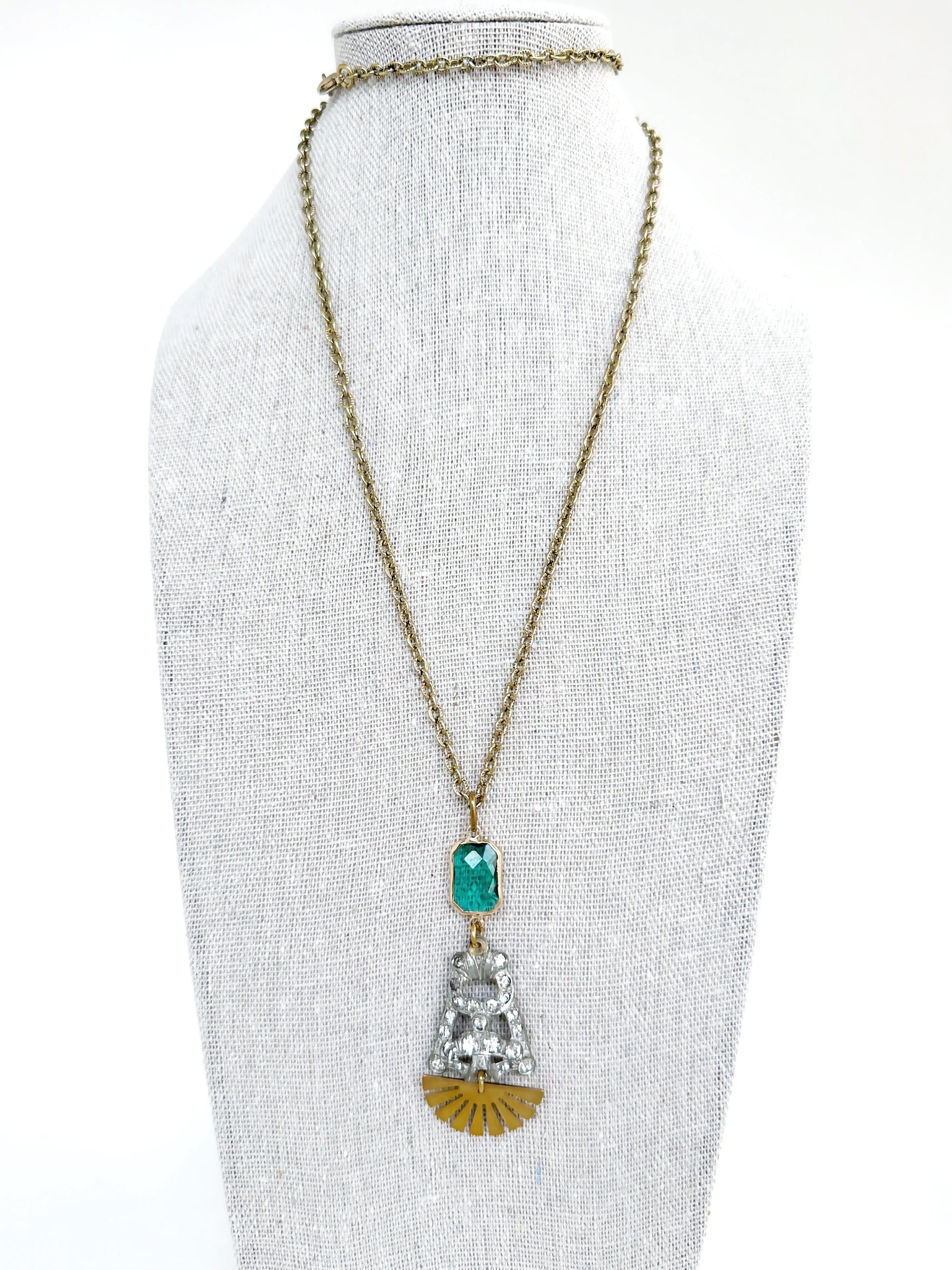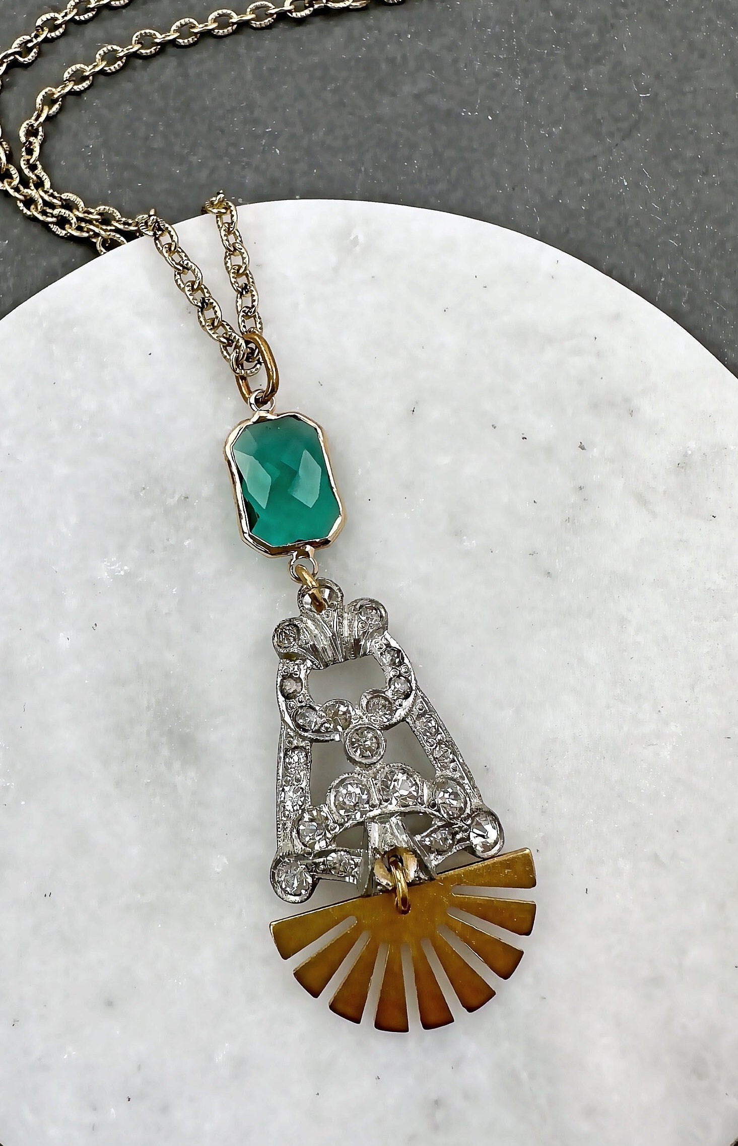 Refashioned Vintage Art Deco rhinestone long pendant necklace with brass sunburst and green crystal