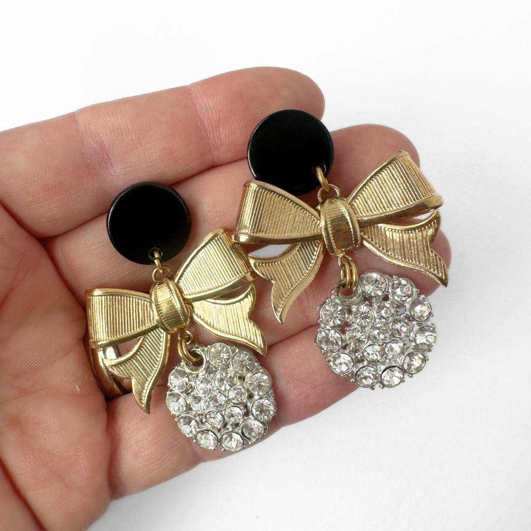 Vintage clear rhinestone button earrings with gold bows and black posts