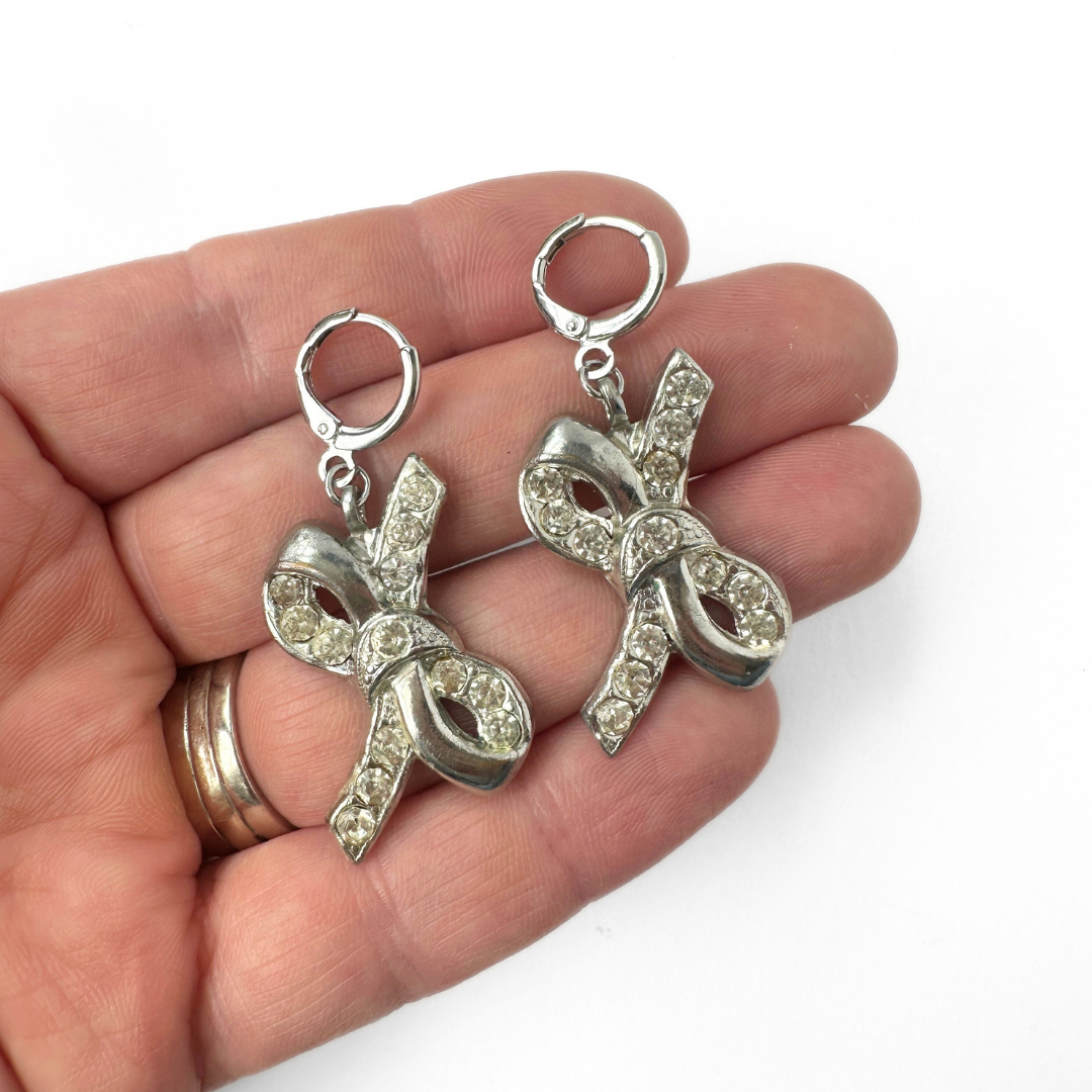 - Vintage bow drops, with clear glass stones in a silver stamped setting