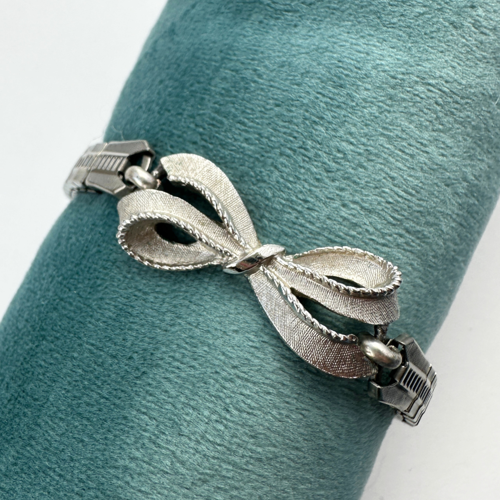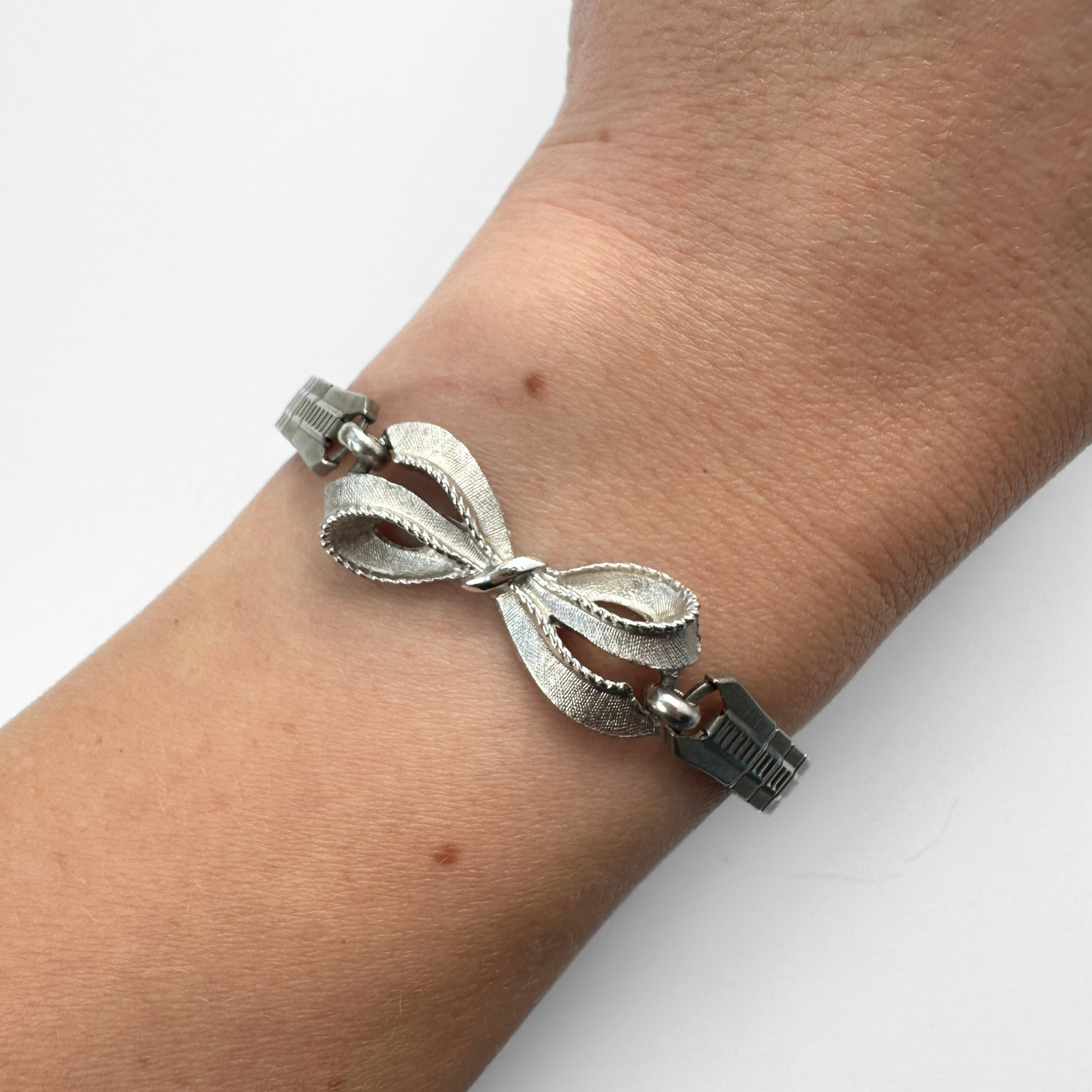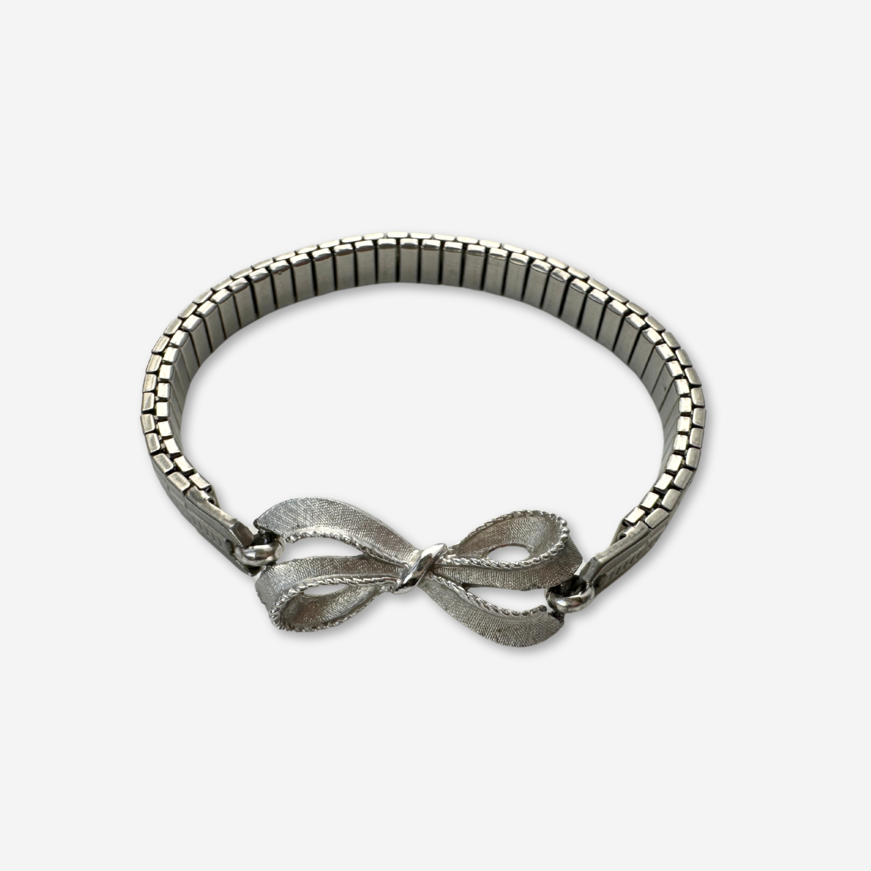 Vintage muted silver bow link centerpiece, attached to a stretchy vintage stainless steel watch band.