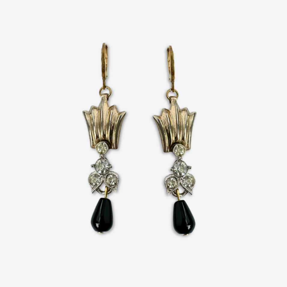 Refashioned vintage fan earrings with clear rhinestone link and black teardrop