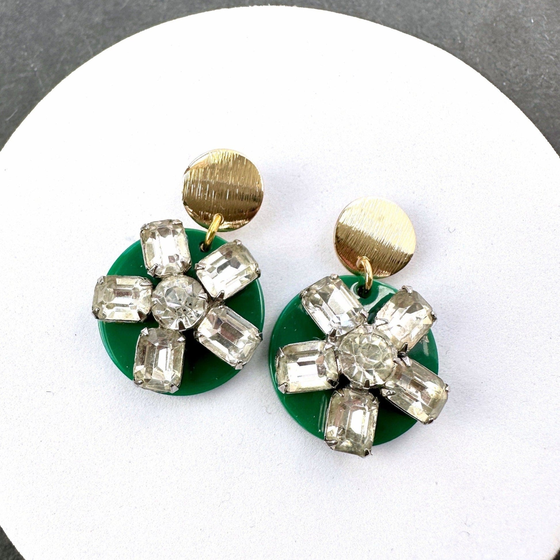 Refashioned Vintage green and clear rhinestone assemblage earrings with brass circular post