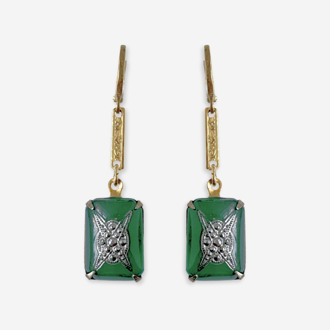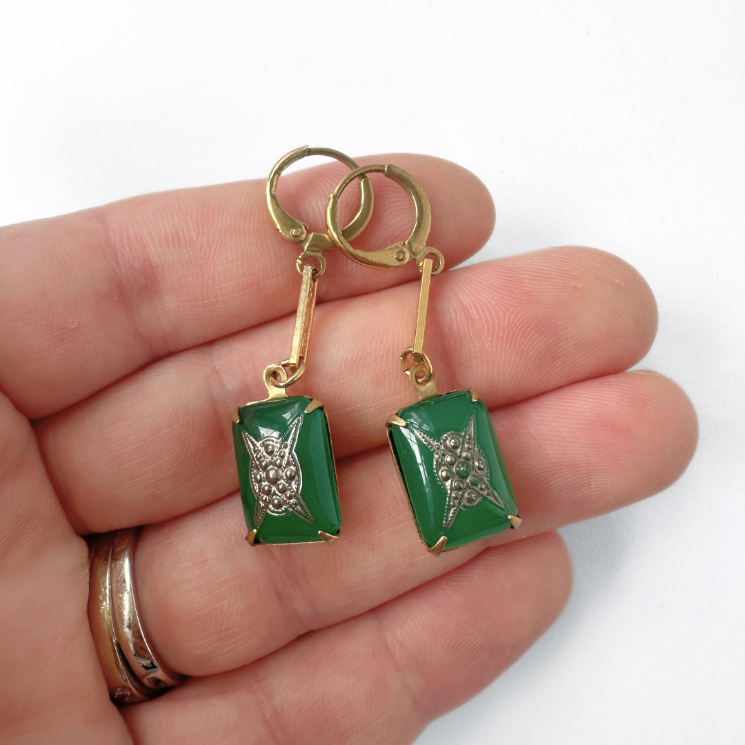 - Vintage smooth green glass cabochons with silver faux marcasite design