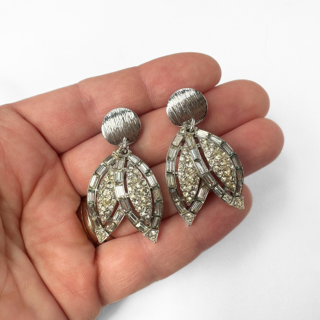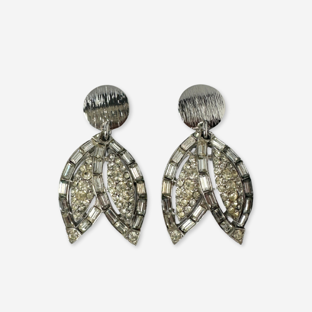 Refashioned vintage large silver and clear rhinestone leaf earrings