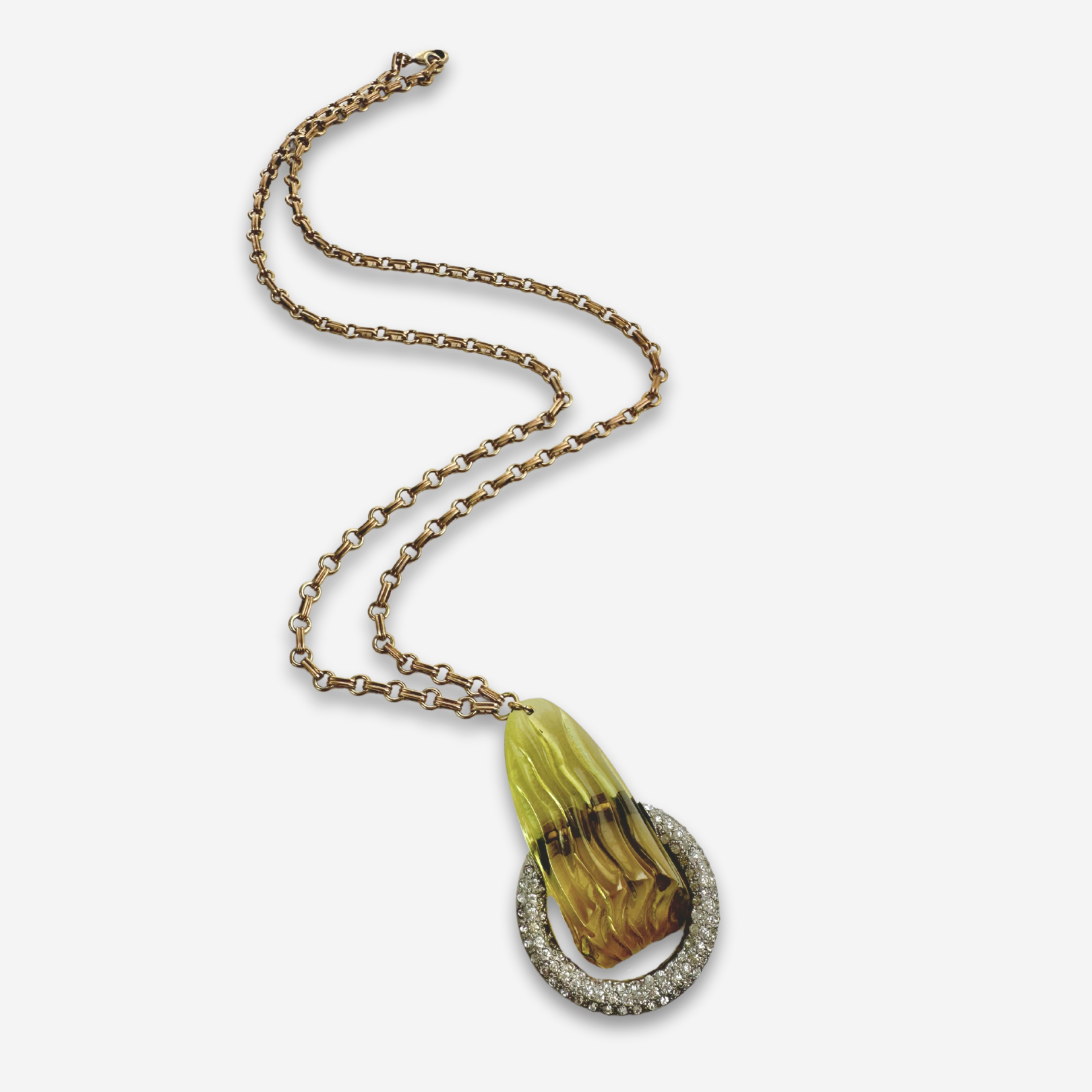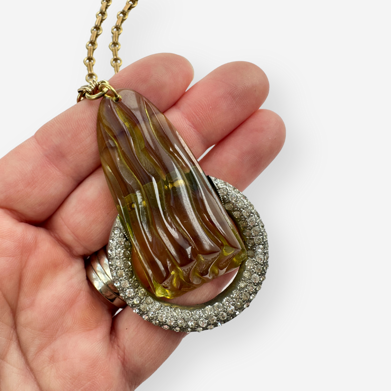 Refashioned vintage olive green lucite and rhinestone deco pendant necklace