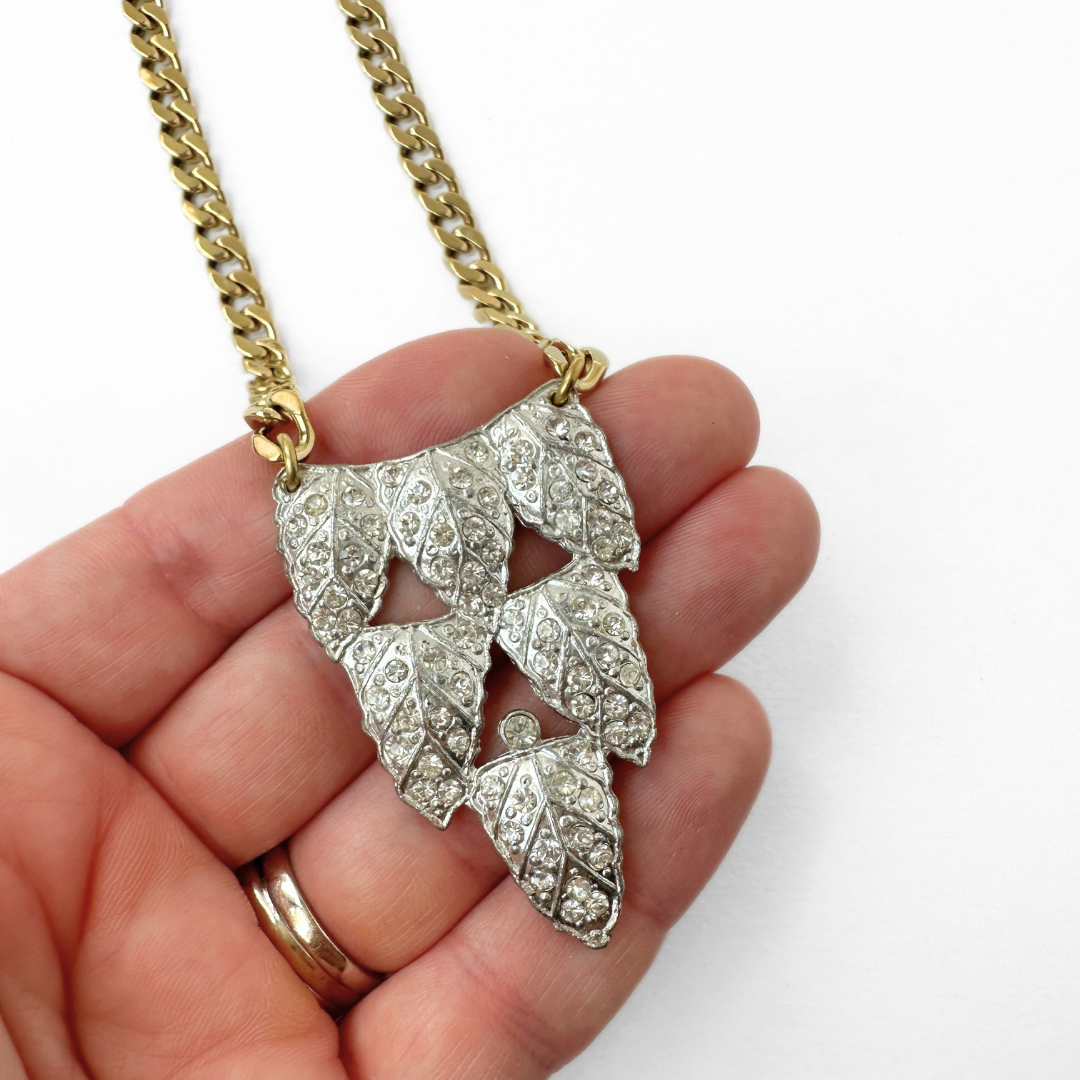 Refashioned vintage rhinestone art deco leaf pendant necklace
