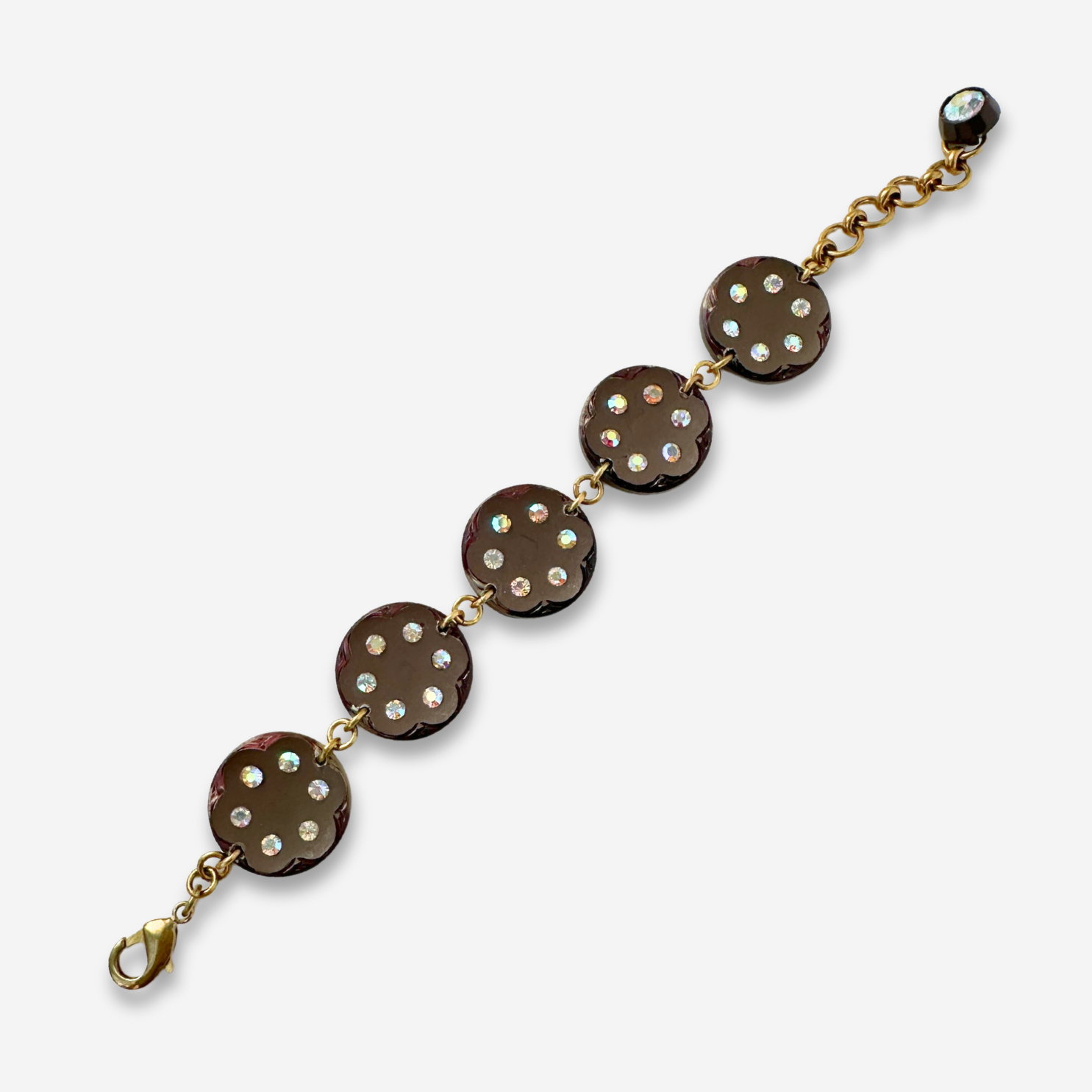 This one of a kind bracelet is composed of five matching vintage buttons. They are a matte brown color with scallop design and iridescent rhinestone accents.