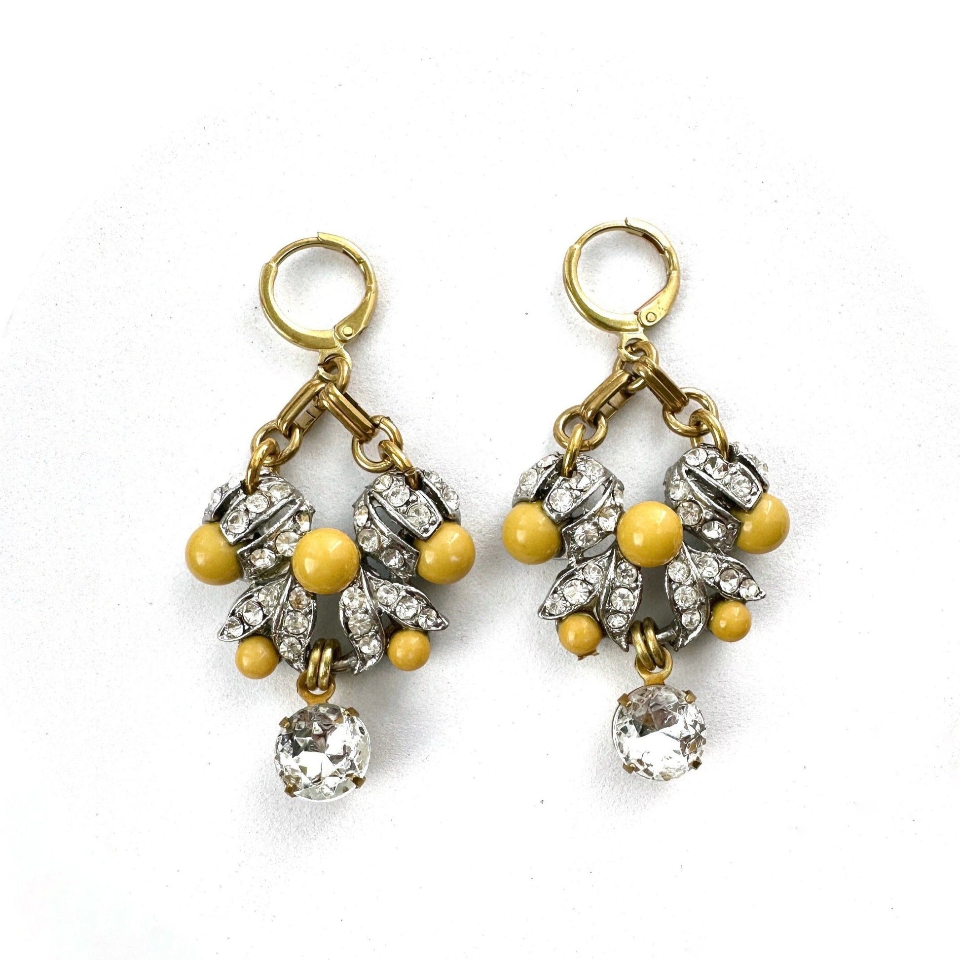 Refashioned vintage yellow and clear rhinestone assemblage statement earrings with raw brass leverbacks