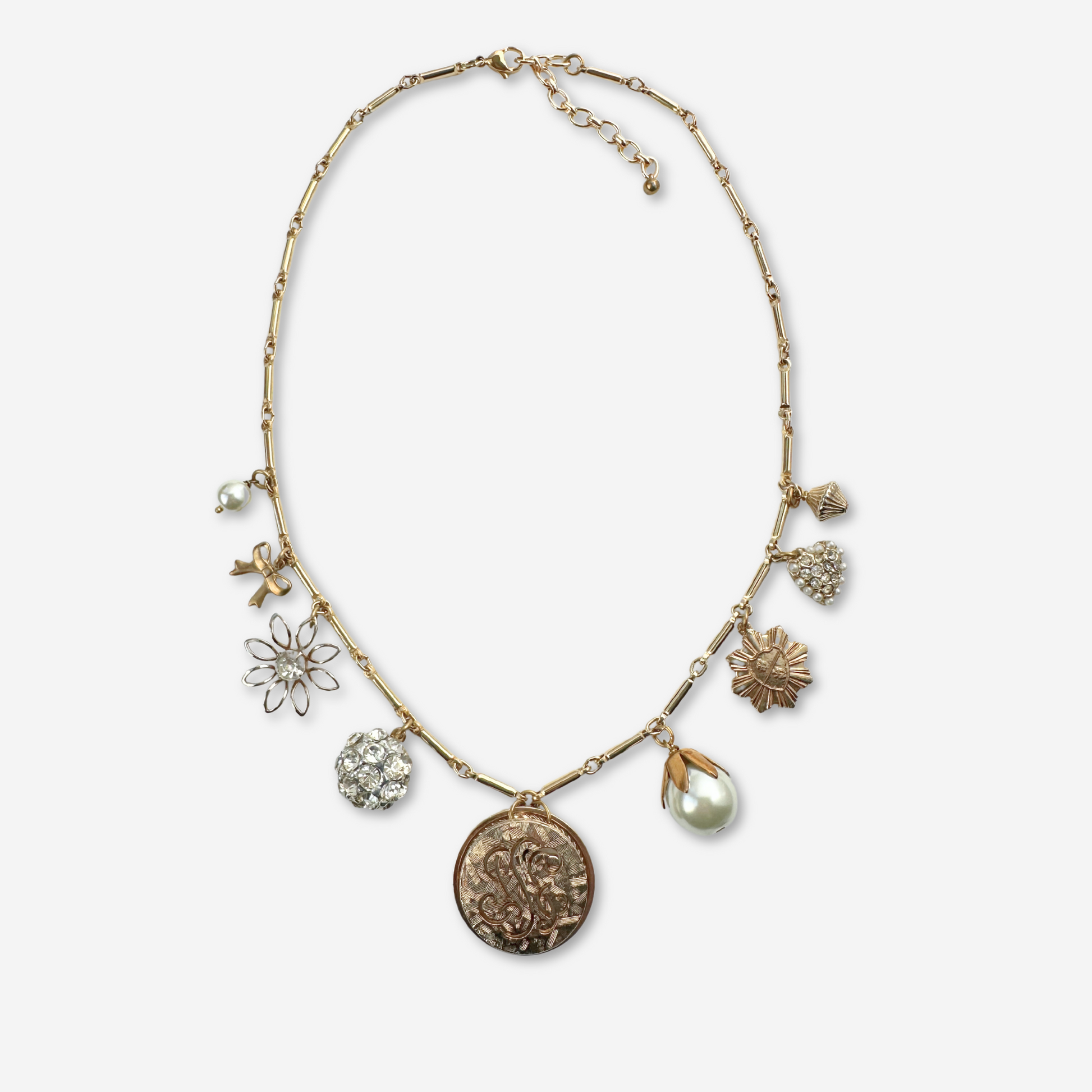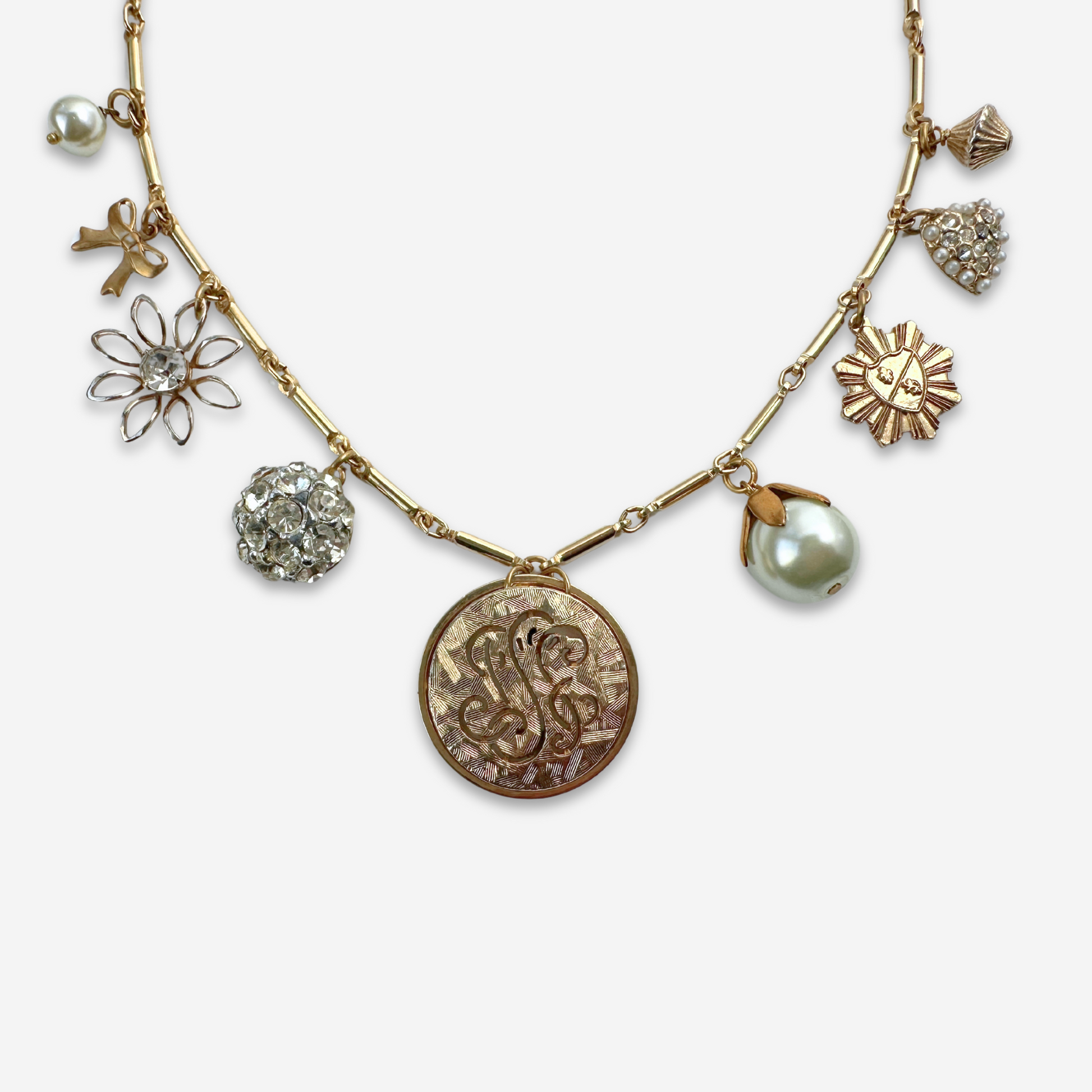 Repurposed gold, pearl and rhinestone vintage charm necklace