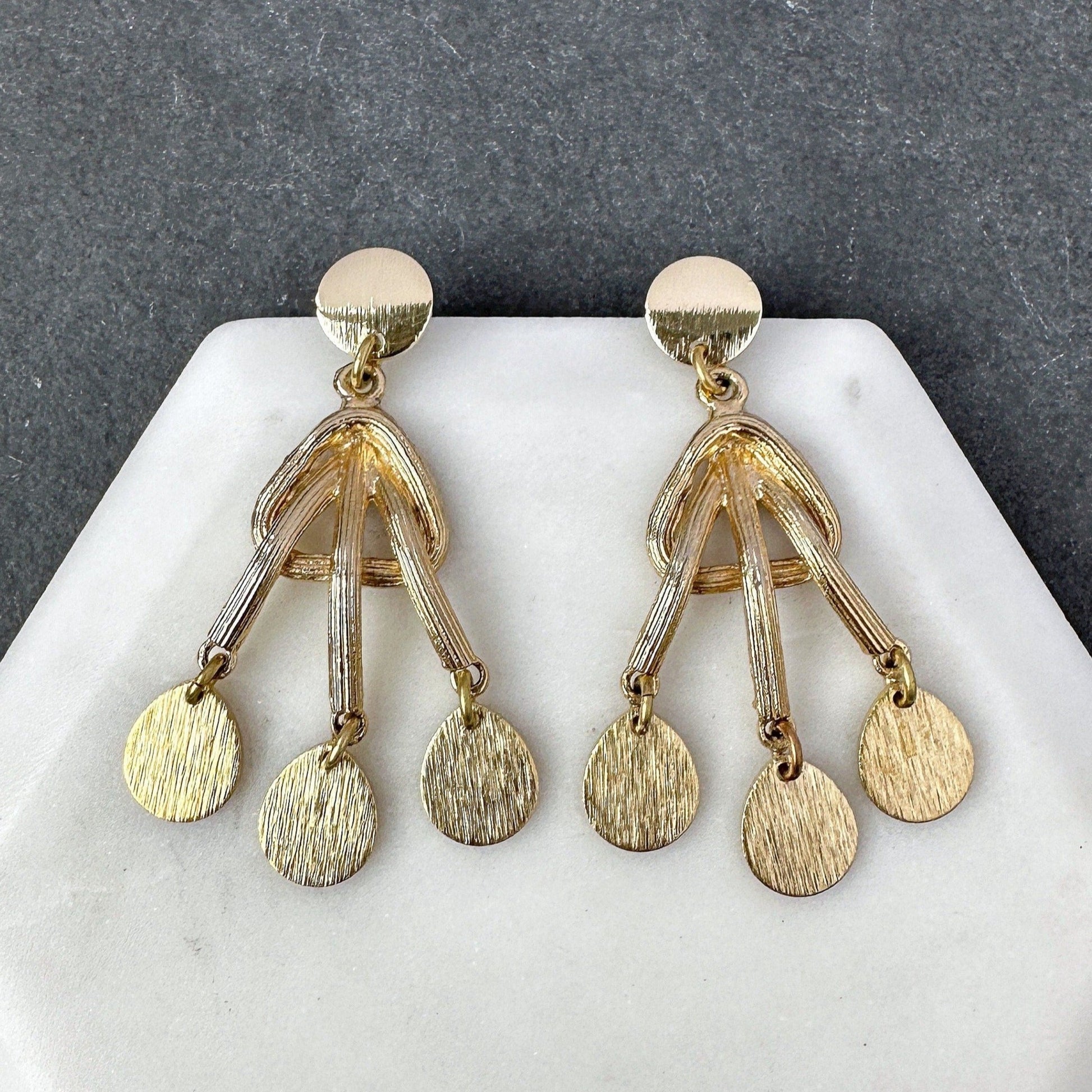 Vintage gold tone connectors have been paired with textured/brushed brass teardrops and circular earring posts.