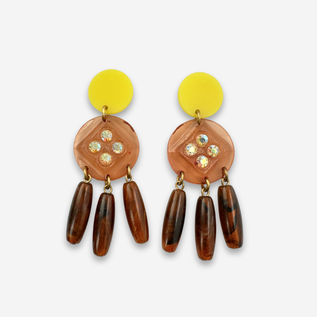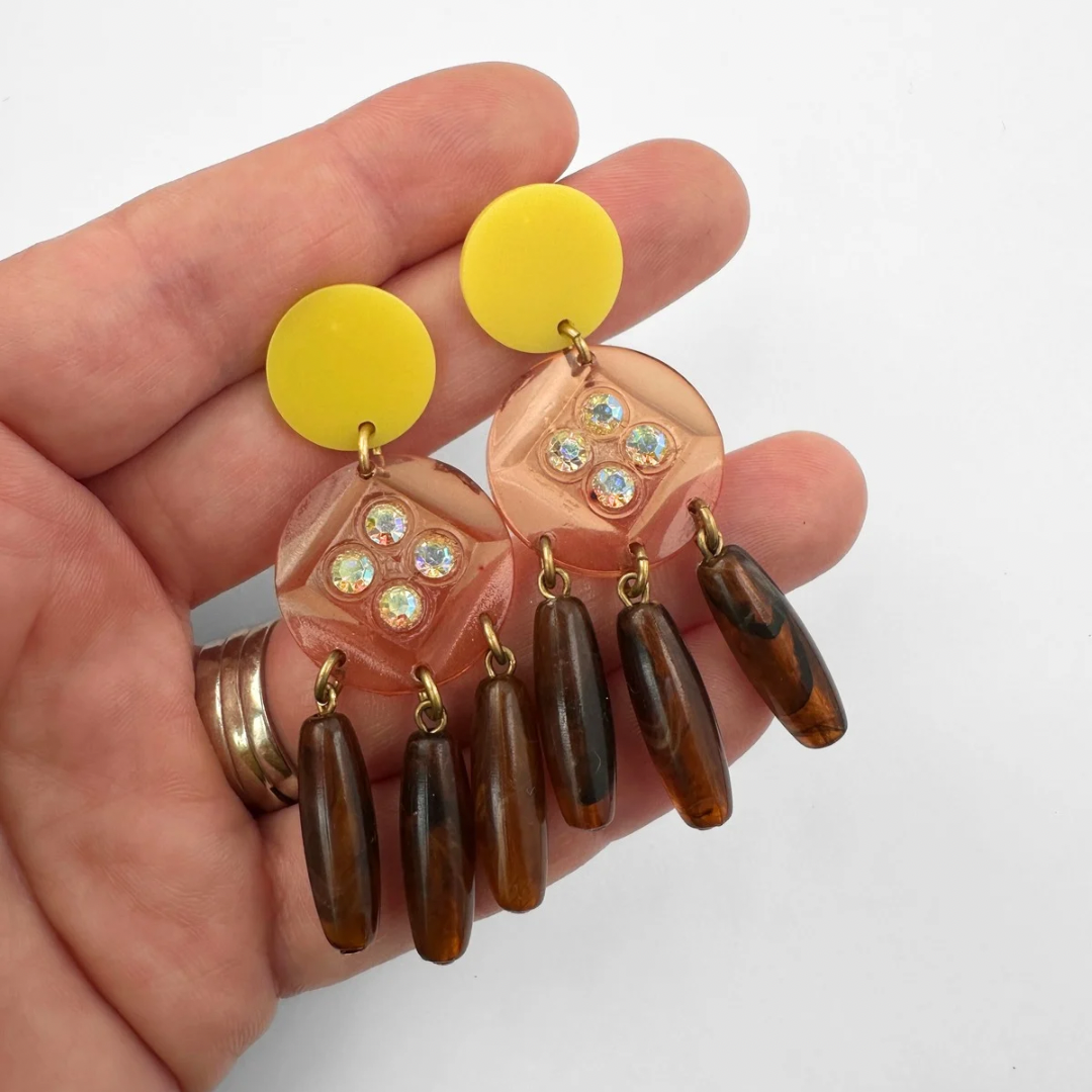 Vintage semi-transparent peach plastic buttons contain iridescent rhinestones, and have been paired with brown tortoise shell oblong beads and bright yellow acetate posts.
