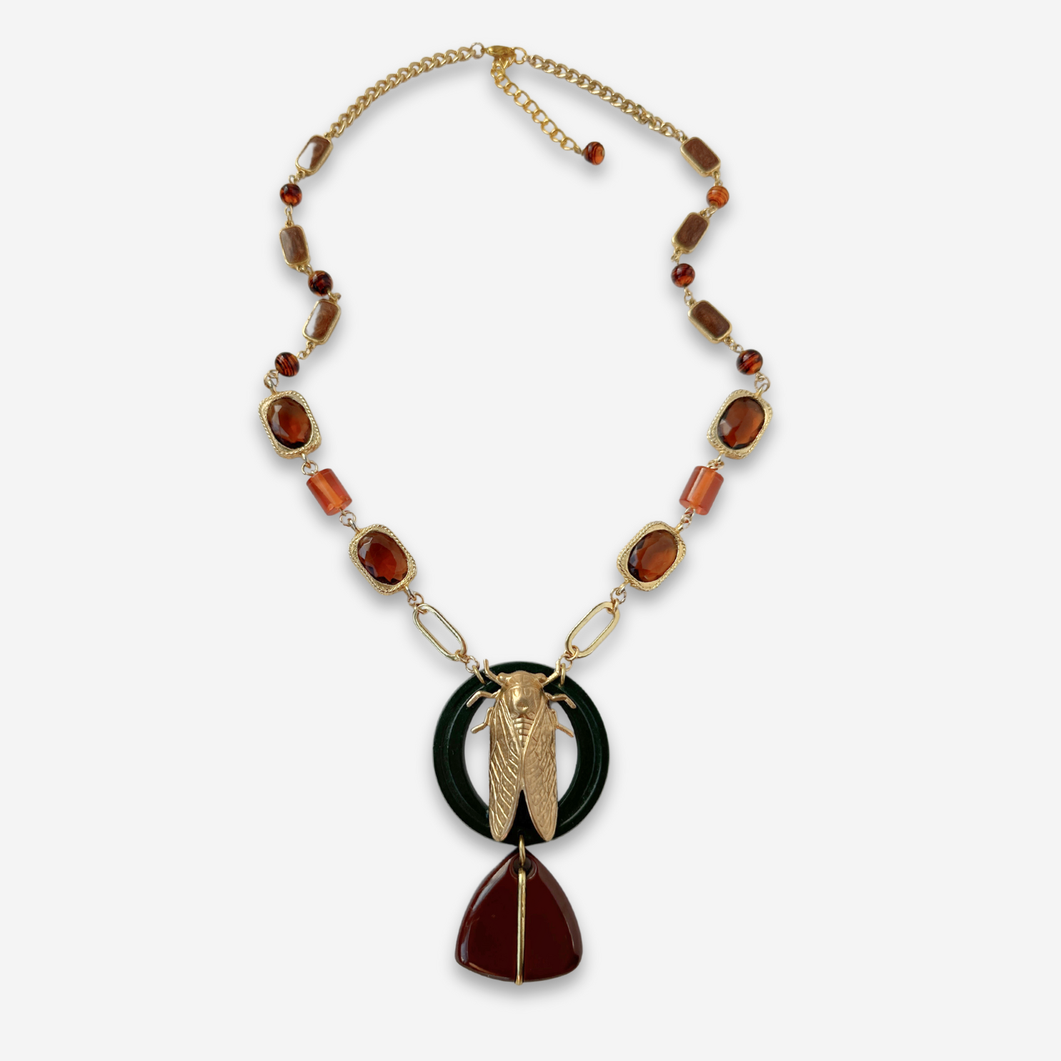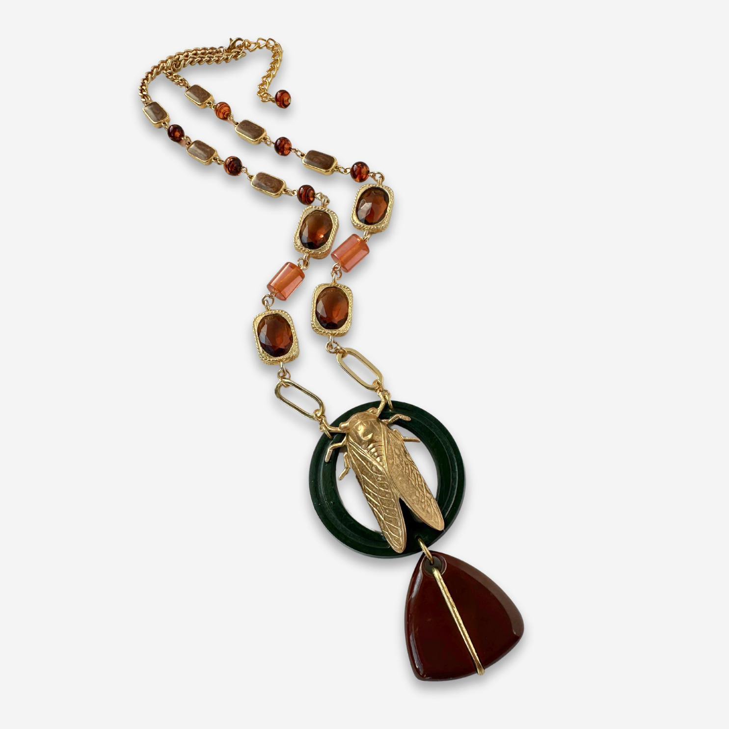 Repurposed Vintage brass Cicada assemblage necklace with bakelite drop