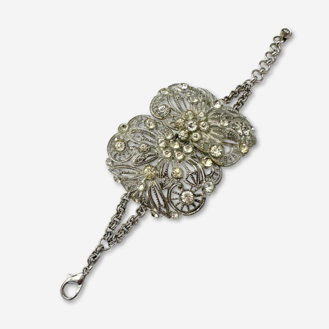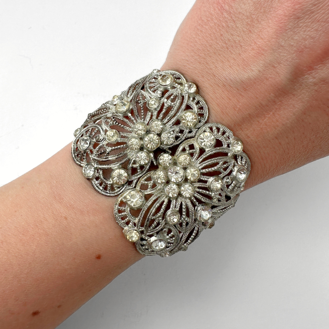 This one of a kind bracelet was created using a vintage two-piece belt buckle. It contains clear glass rhinestones in a silver tone setting, and is conected at the center with a hook that I've bent closed.
