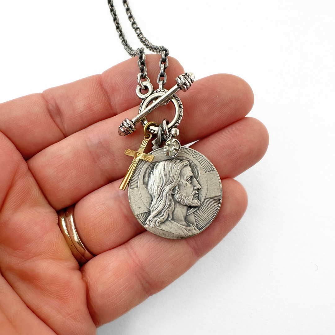 Repurposed vintage pewter Jesus Christ religious medallion necklace