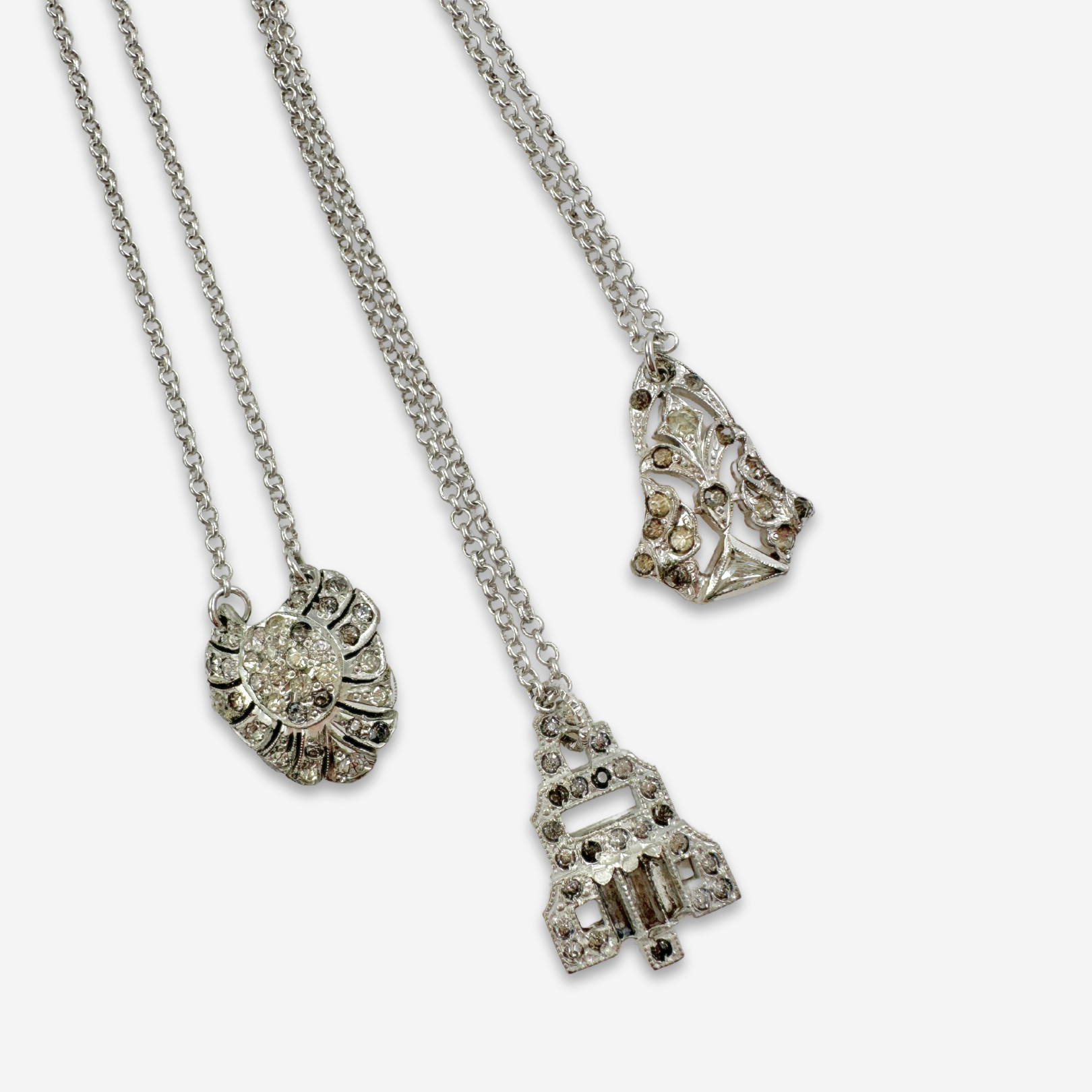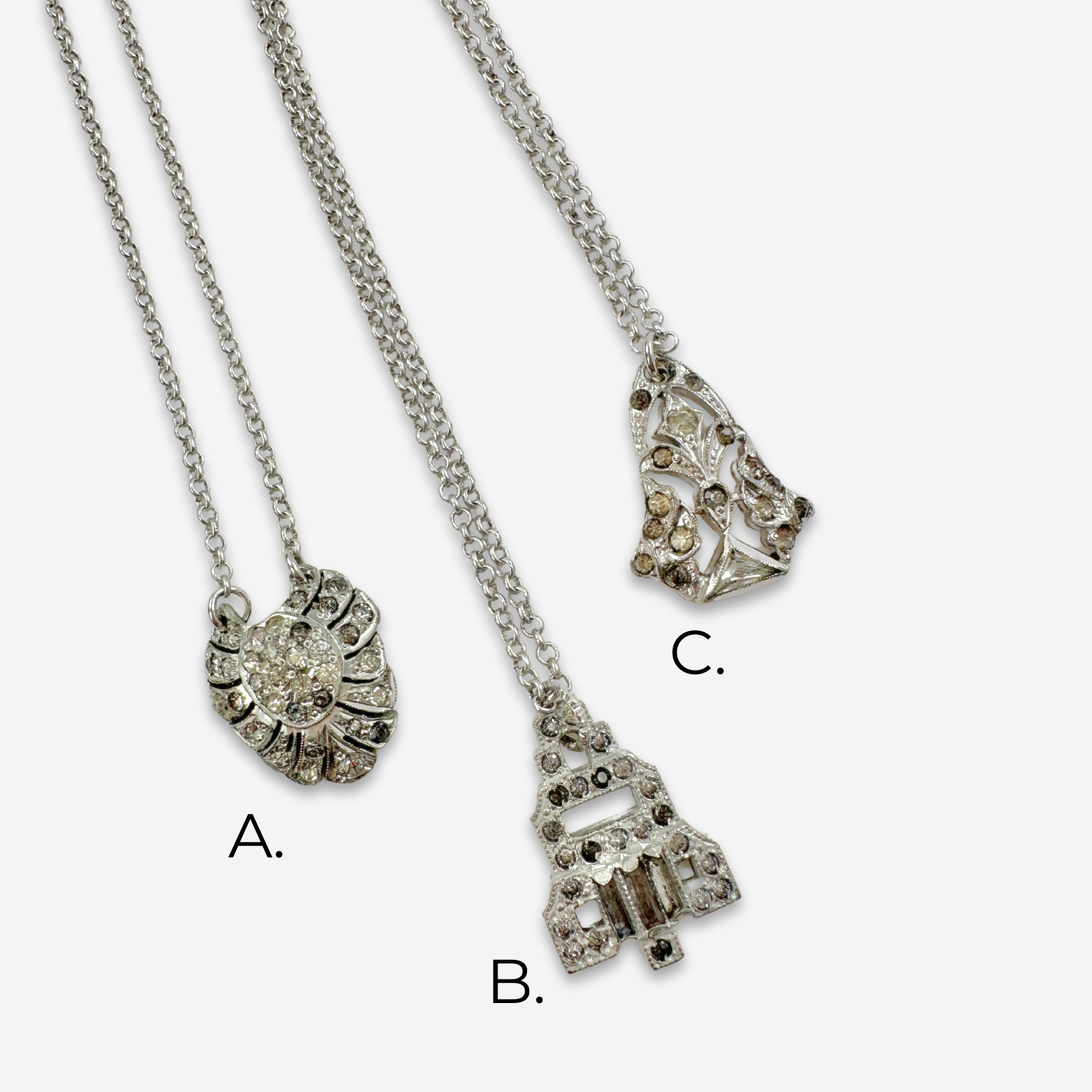 Each piece features a small vintage rhinestone pendant (originally dress clips from the art deco era.) Thin matte silver plated rolo chain with lobster claw clasp.