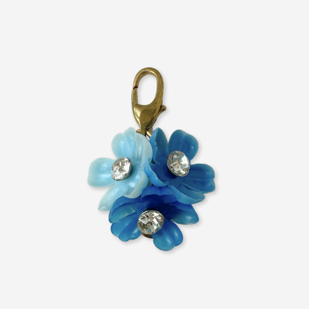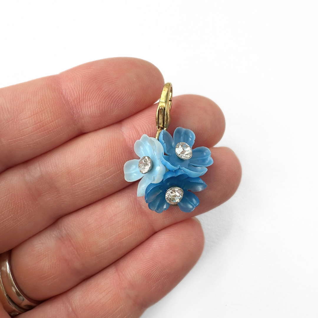 - Vintage charm featuring blue plastic flowers with clear rhinestone centers