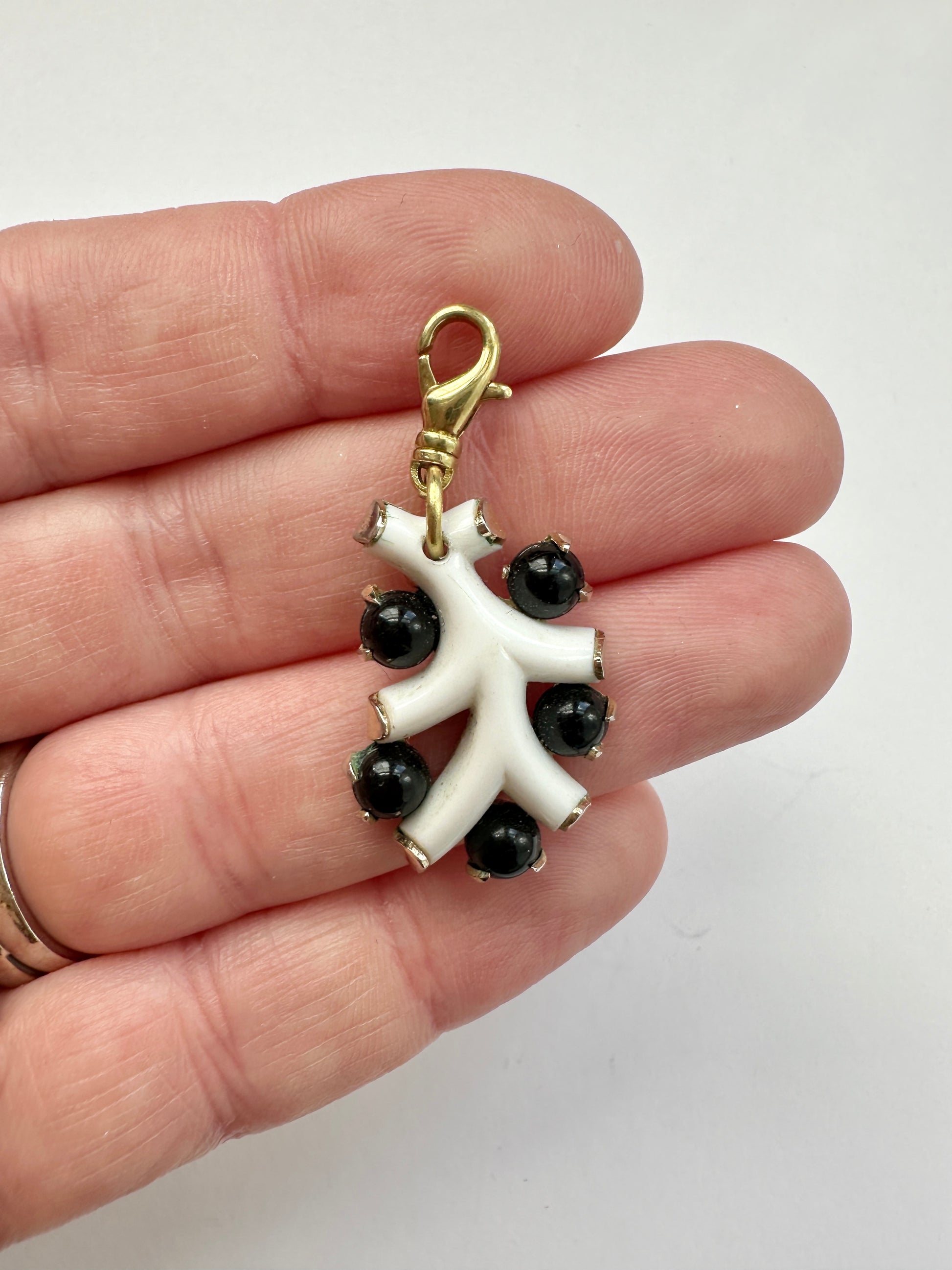 This one of a kind charm was originally a clip-on earring, and features black and white celluloid in a gold tone setting.