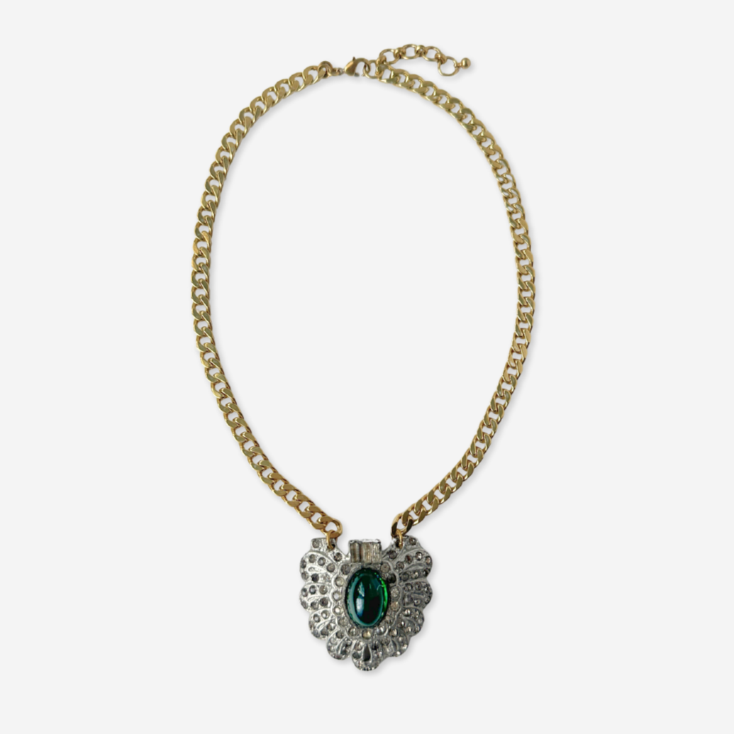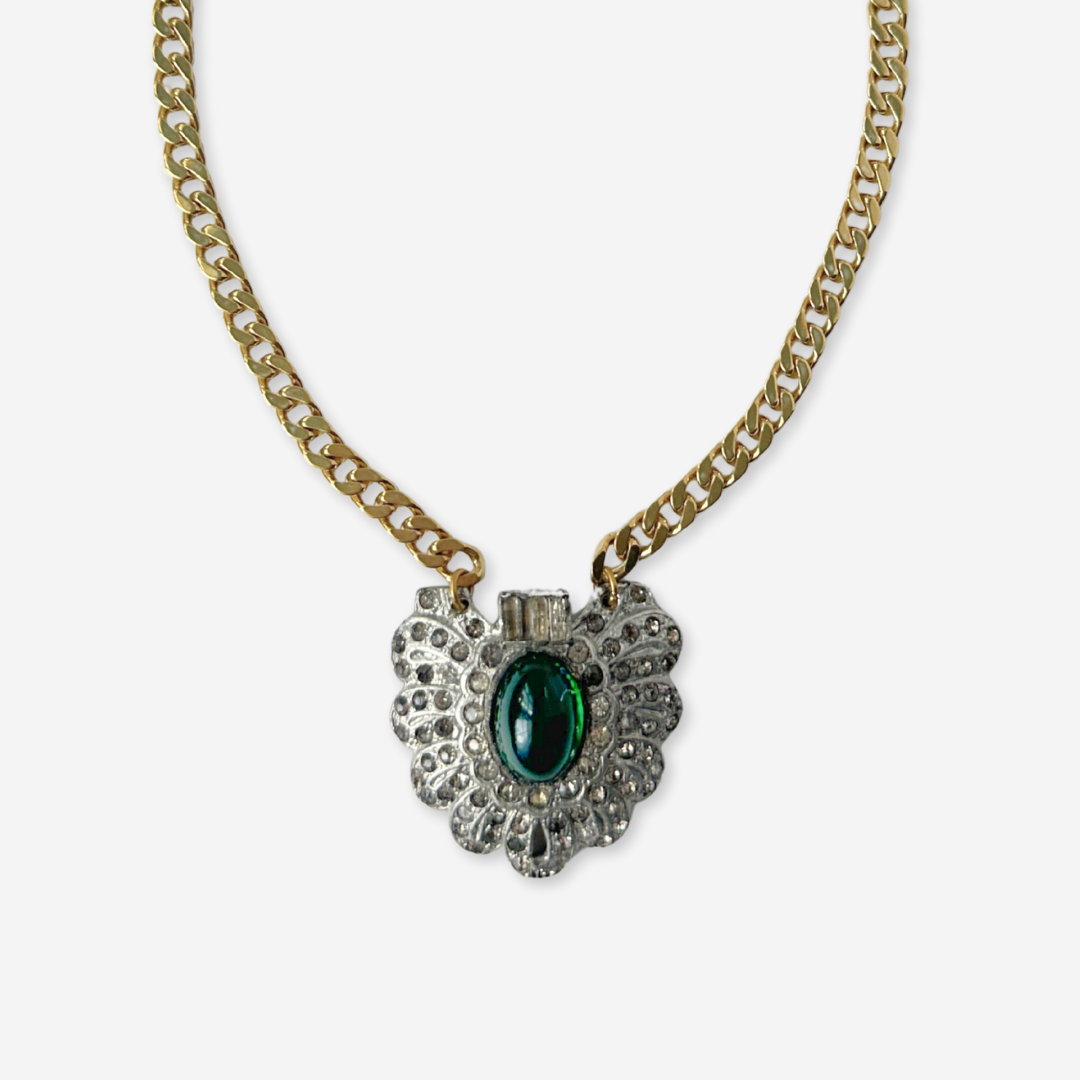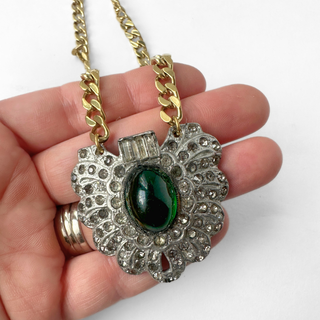 Large refashioned vintage clear and emerald rhinestone deco pendant necklace