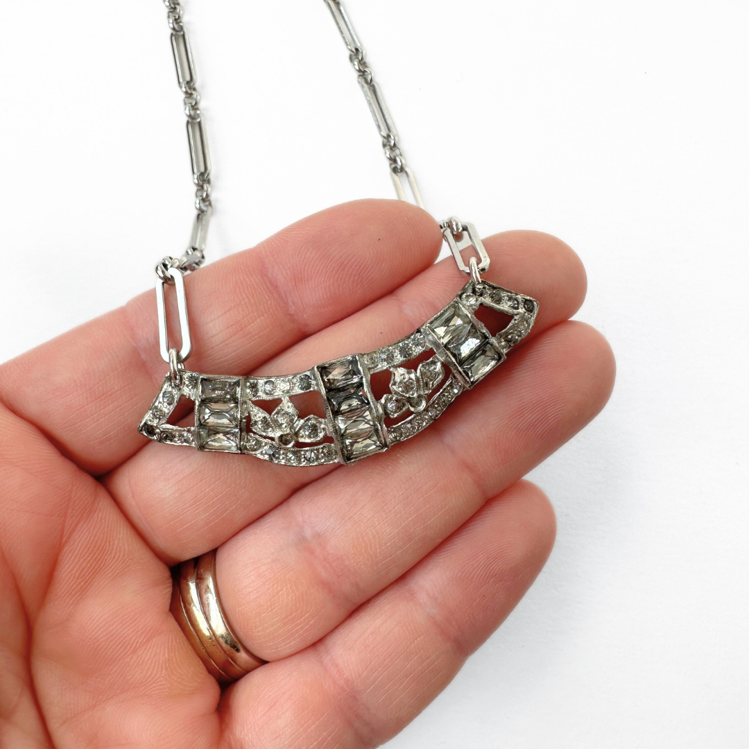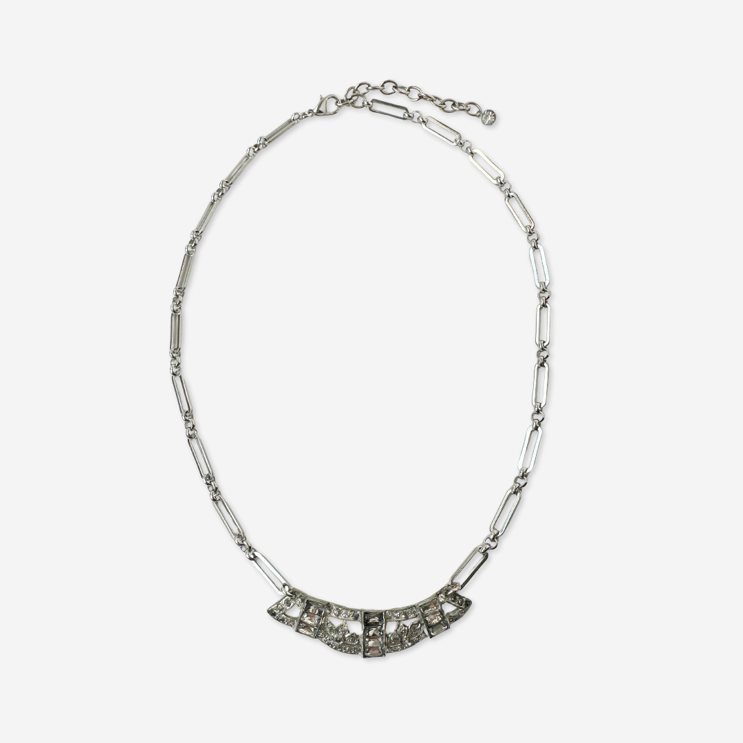 Vintage wide rhinestone pendant with silver plated oval link chain