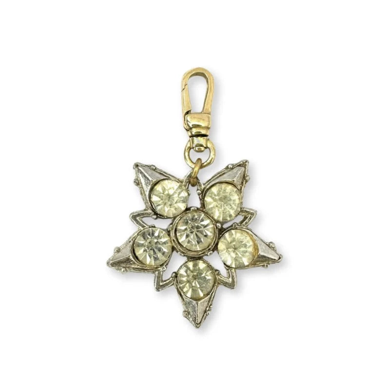 This one of a kind charm features clear glass rhinestones in a silver tone setting. It was originally a vintage button.