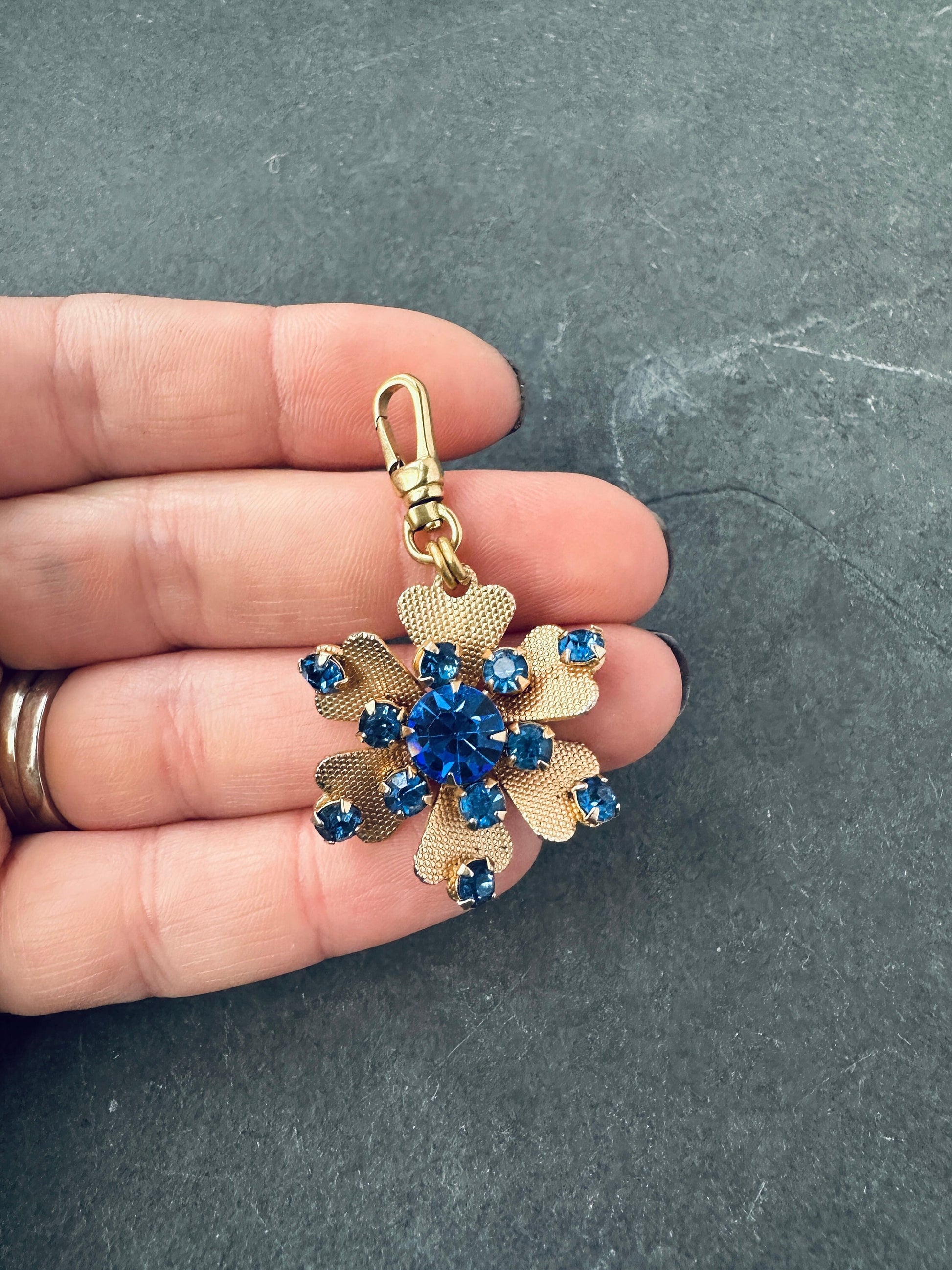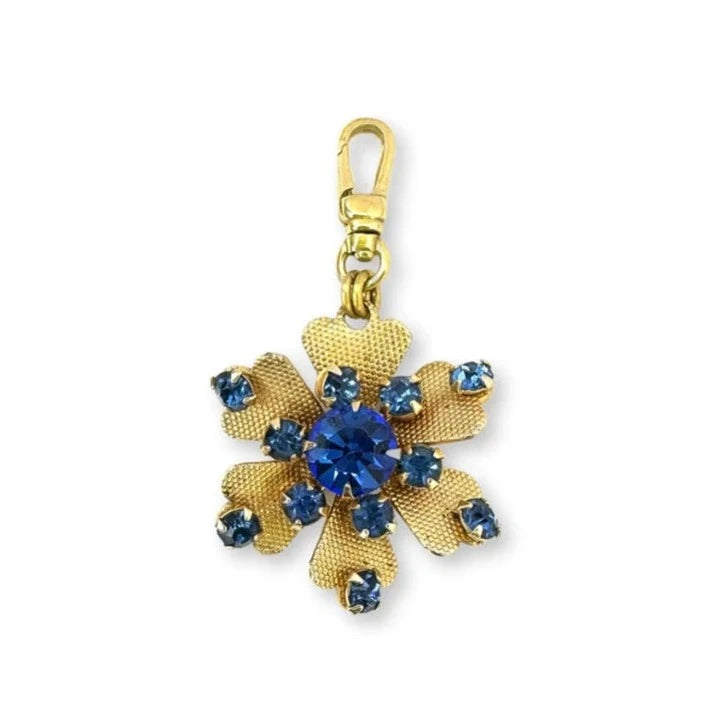 This one of a kind charm features blue glass rhinestones in a brass. floral setting. It was originally a vintage pin.