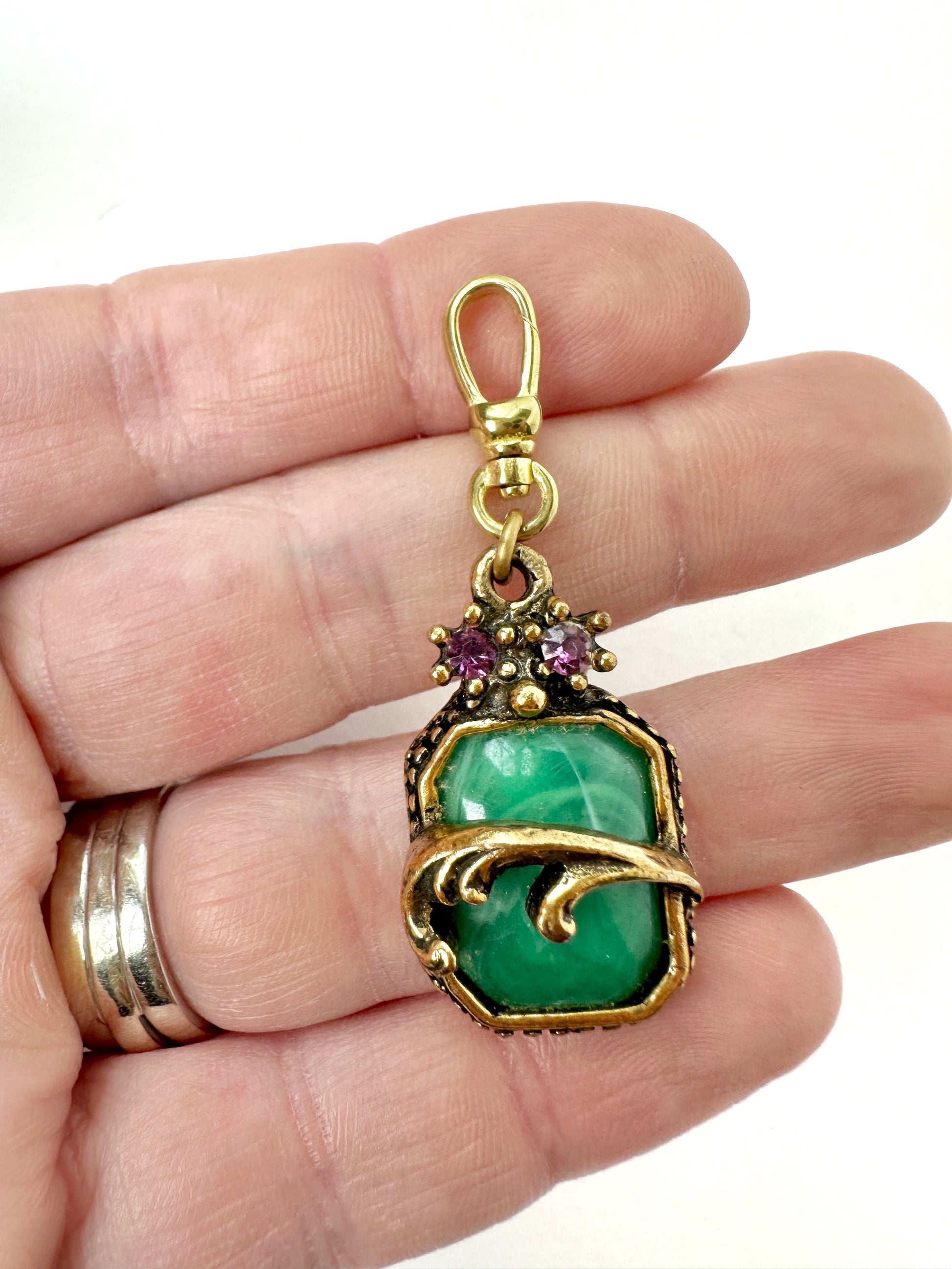 This charm was originally a vintage earring and features a Kelly green cabochon in an antique brass setting, with purple rhinestone accent.