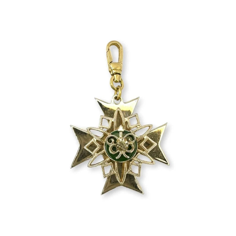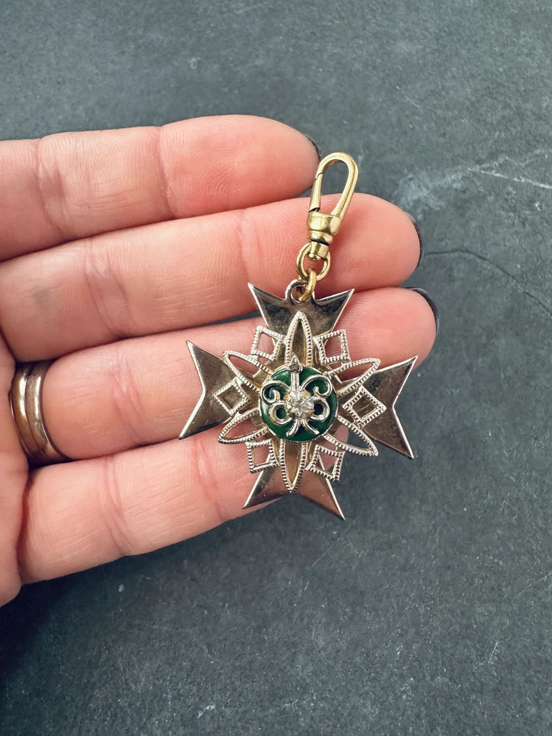 This one of a kind charm features a clear rhinestone and green enamel center on a muted gold plated crest. It was originally a pendant.
