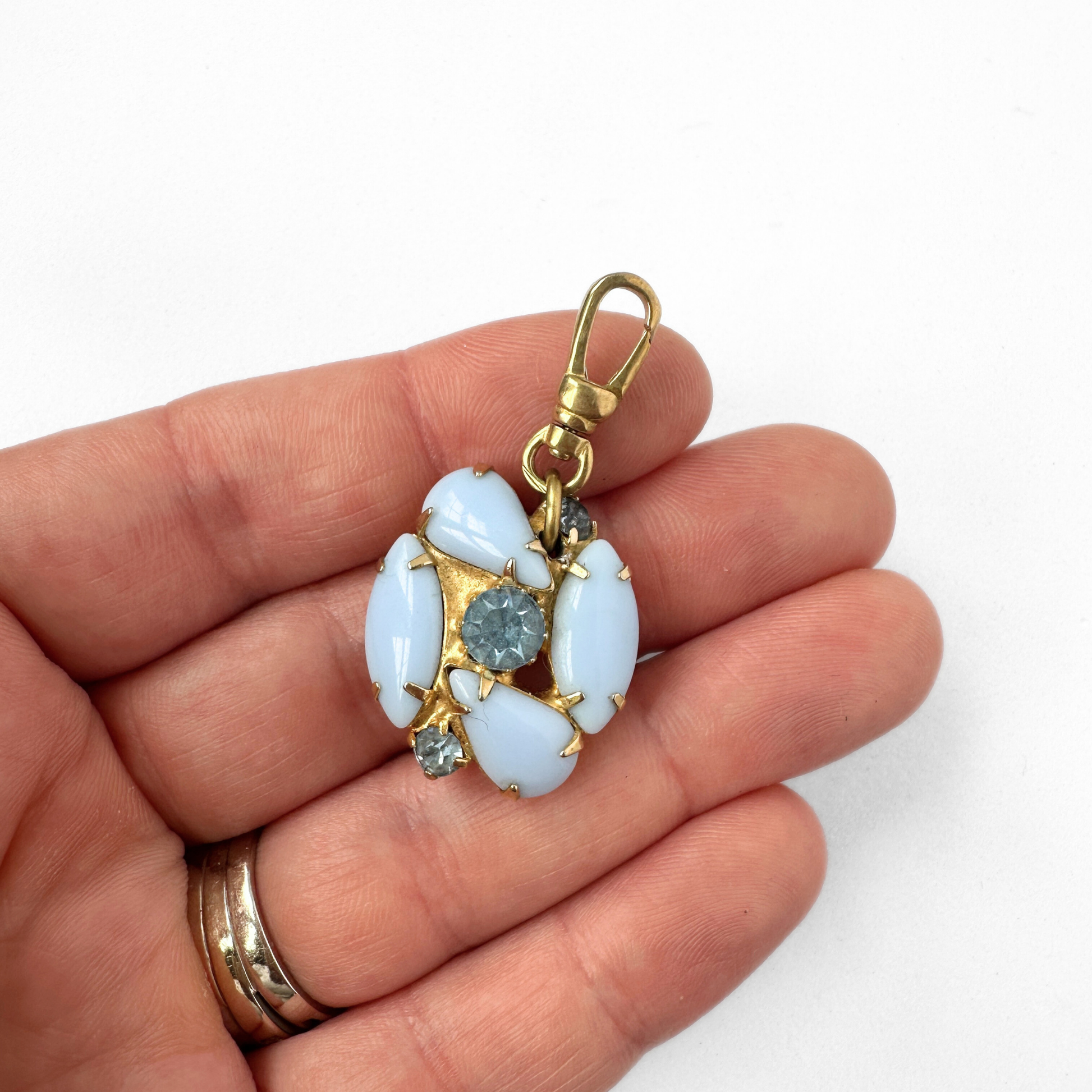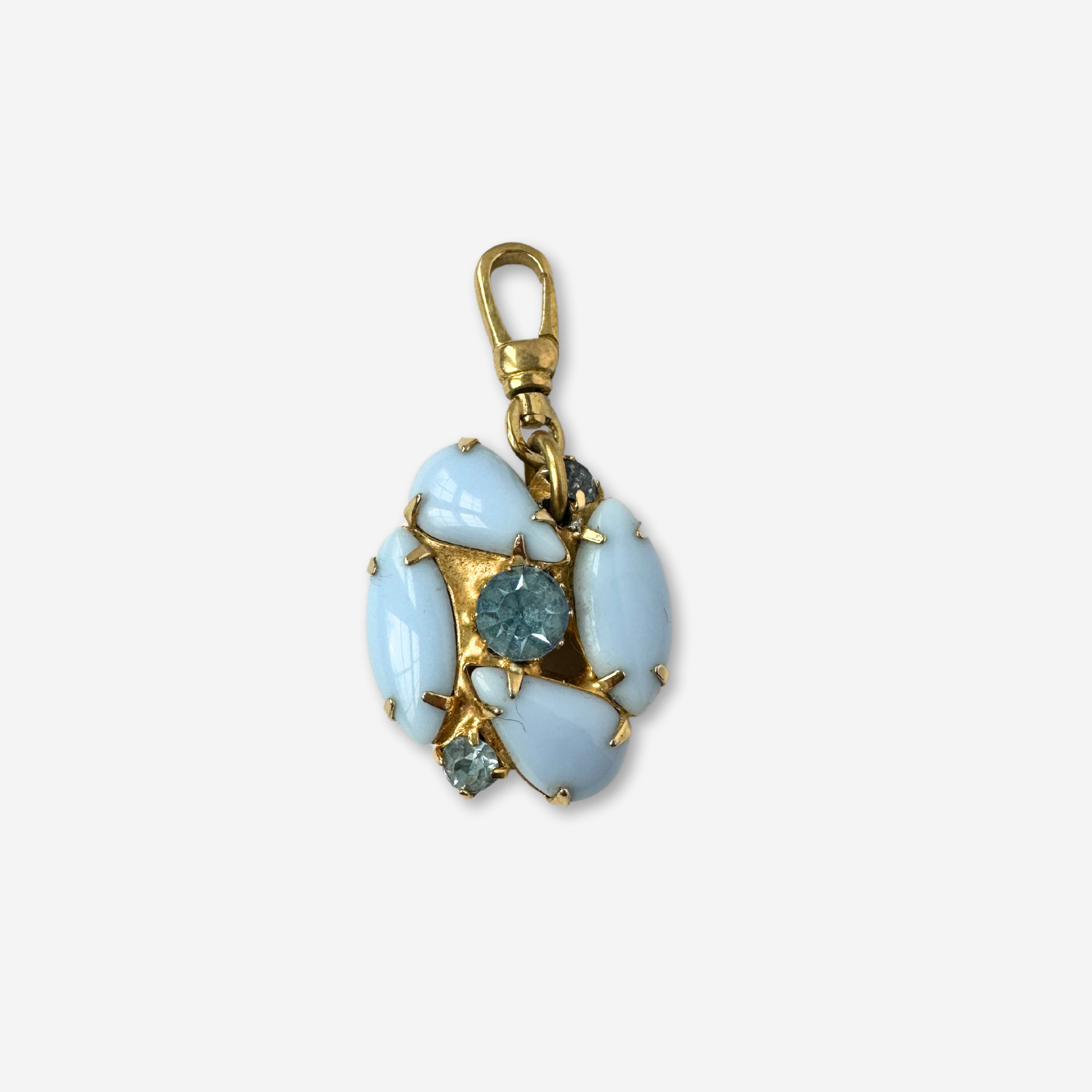 This one of a kind charm was originally a vintage clip-on earring, and has opaque periwinkle and transparent light blue glass rhinestones in a gold tone pronged setting.
