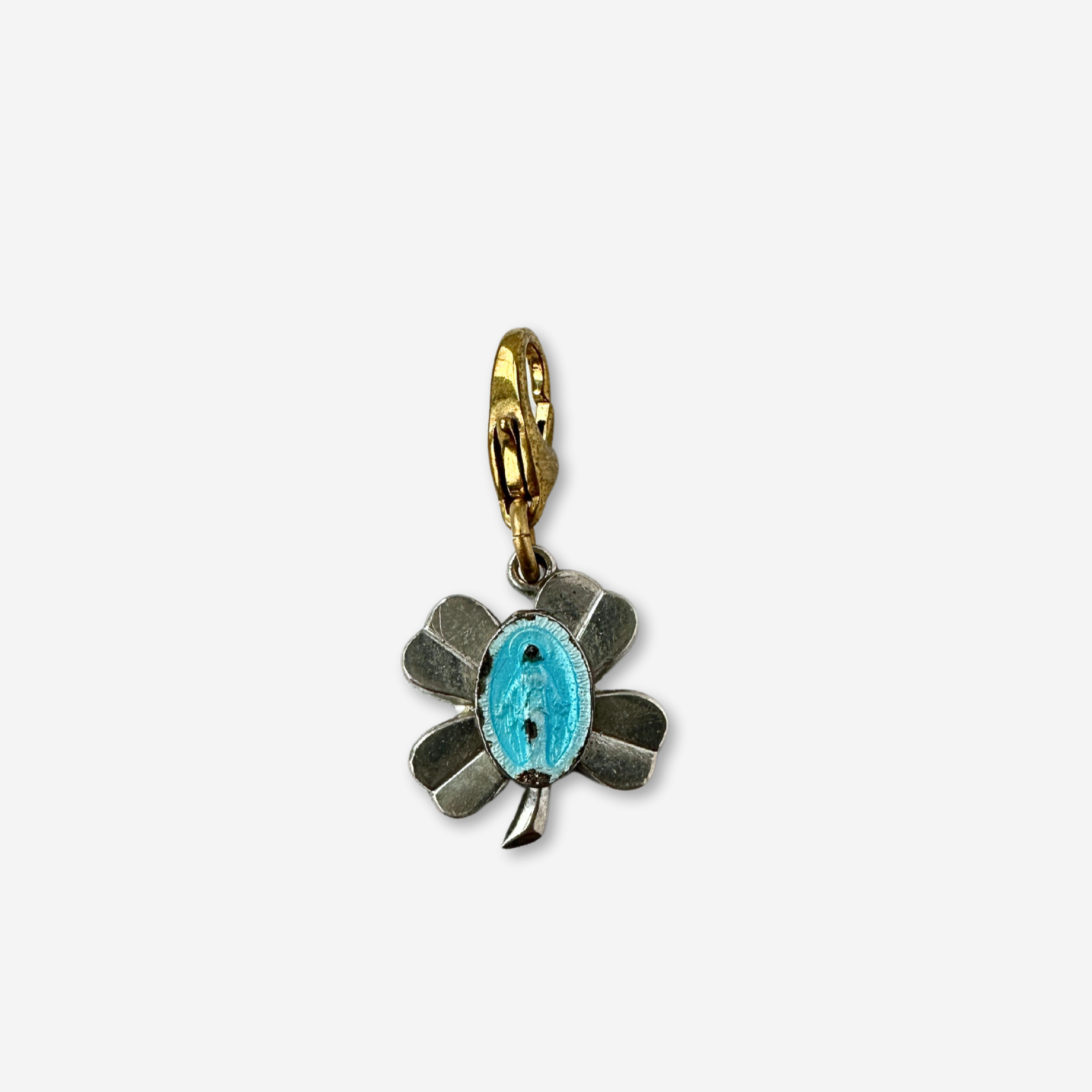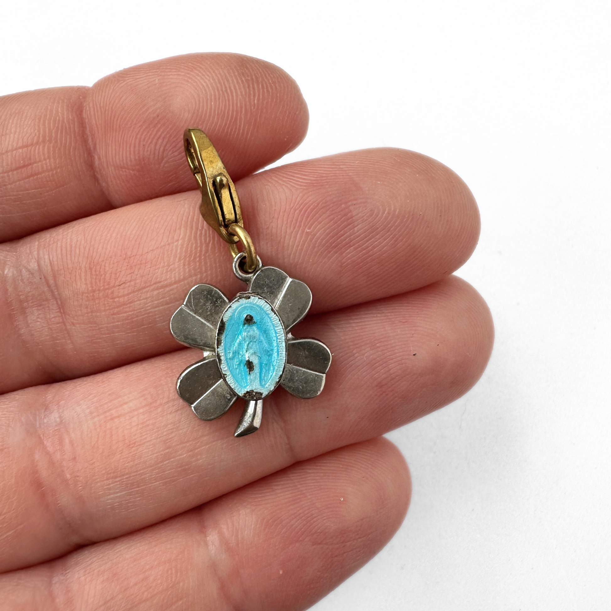 Unique silver and blue enamel miraculous medal clover charm. The enamel does shoe some wear, consistent with age.